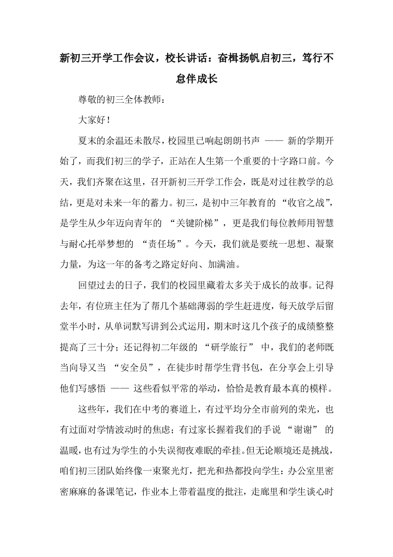 新初三开学工作会议,校长讲话:奋楫扬帆启初三,笃行不怠伴成长尊敬的初三全体教师:大家好!夏末的余温还未散尽,校园里已响起朗朗书声一一新的学期开始了,而我们初三的学子,正站在人生第一个重要的十字路口前。今天,我们齐聚在这里,召开新初三开学工作会,既是对过往教学的总结,更是对未来一年的蓄力。初三,是初中三年教育的“收官之战”,是学生从少年迈向青年的“关键阶梯”,更是我们每位教师用智慧与耐心托举梦想的“责任场”。今天,我们就是要统一思想、凝聚力量,为这一年的备考之路定好向、加满油。回望过去的日子,我们的校园里藏着太多关于成长的故事。记得去年,有位班主任为了帮几个基础薄弱的学生赶进度,每天放学后留堂半小时,从单词默写讲到公式运用,期末时这几个孩子的成绩整整提高了三十分;还记得初二年级的“研学旅行”中,我们的老师既当向导又当“安全员”,在徒步时帮学生背书包,在分享会上引导他们写感悟一一这些看似平常的举动,恰恰是教育最本真的模样。这些年,我们在中考的赛道上,有过平均分全市前列的荣光,也有过面对学情波动时的焦虑;有过家长握着我们的手说“谢谢”的温暖,也有过为学生的小失误彻夜难眠的牵挂。但无论顺境还是挑战,咱们初三团队始终像一束聚光灯,把光和热都投向学生:办公室里密密麻麻的备课笔记,作业本上带着温度的批注,走廊里和学生谈心时