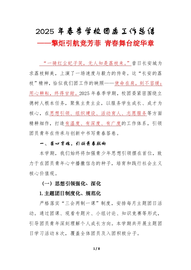 擎炬引航竞芳菲青春舞台绽华章“一骑红尘妃子笑,无人知是荔枝来。”昔日长安城为求荔枝鲜美,上演了一场速度与毅力的传奇。这“长安的荔枝”精神,恰似我们团工作的映照一一使命在肩,刻不容缓:用心耕耘,终得甘甜。2025年春季学期,校团委紧密围绕立德树人根本任务,聚焦主责主业,以服务学生成长、成才为核心,在思想引领、组织建设、活动育人、志愿服务等方面精耕细作,打造有温度、有深度、有广度的工作体系,引领团员青年在传承与创新中书写青春答卷。本学期,我们始终将加强青少年思想引领摆在首位,致力于在团员青年心中播撒信念的种子,培育和践行社会主义核心价值观。(一)思想引领强化、深化1.主题团日制度化、规范化严格落实“三会两制一课”制度,安排每月主题团日活动。通过团课、观看专题片、小组讨论、知识竞赛等形式,引导团员青年深刻理解个人成长方向。本学期共开展主题团日学习活动8次,覆盖全体团员及入团积极分子。1/8