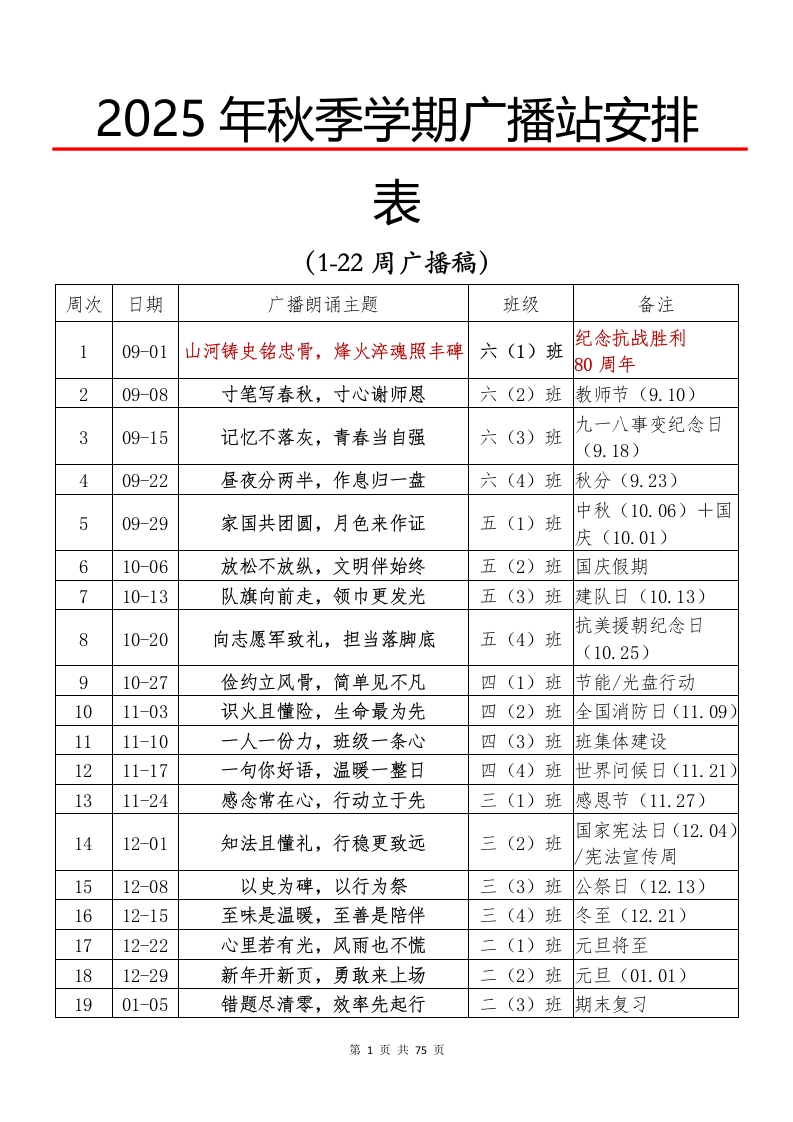 2025年秋季学期广播站安排表(1-22周广播稿)周次日期广播朗诵主题班级备注纪念抗战胜利109-01山河铸史铭忠骨,烽火淬魂照丰碑六(1)班80周年209-08寸笔写春秋,寸心谢师恩六(2)班教师节(9.10)309-15记忆不落灰,青春当自强六(3)班九一八事变纪念日(9.18)409-22昼夜分两半,作息归一盘六(4)班秋分(9.23)中秋(10.06)+国09-29家国共团圆,月色来作证五(1)班庆(10.01)610-06放松不放纵,文明伴始终五(2)班国庆假期710-13队旗向前走,领巾更发光五(3)班建队日(10.13)抗美援朝纪念日810-20向志愿军致礼,担当落脚底五(4)班(10.25)910-27俭约立风骨,简单见不凡四(1)班节能/光盘行动1011-03识火且懂险,生命最为先四(2)班全国消防日(11.091111-10一人一份力,班级一条心四(3)班班集体建设1211-17一句你好语,温暖一整日四(4)班世界问候日(11.211311-24感念常在心,行动立于先三(1)班感恩节(11.27)三国家宪法日(12.04)1412-01知法且懂礼,行稳更致远(2)班宪法宣传周1512-08以史为碑,以行为祭三(3)班公祭日(12.13)1612-15至味是温暖,至善是陪伴三(4)班冬至(12.21)1712-22心里若有光,风雨也不慌(1)班元旦将至1812-29新年开新页,勇敢来上场(2)班元旦(01.01)1901-05错题尽清零,效率先起行(3)班期末复习第1页共75页