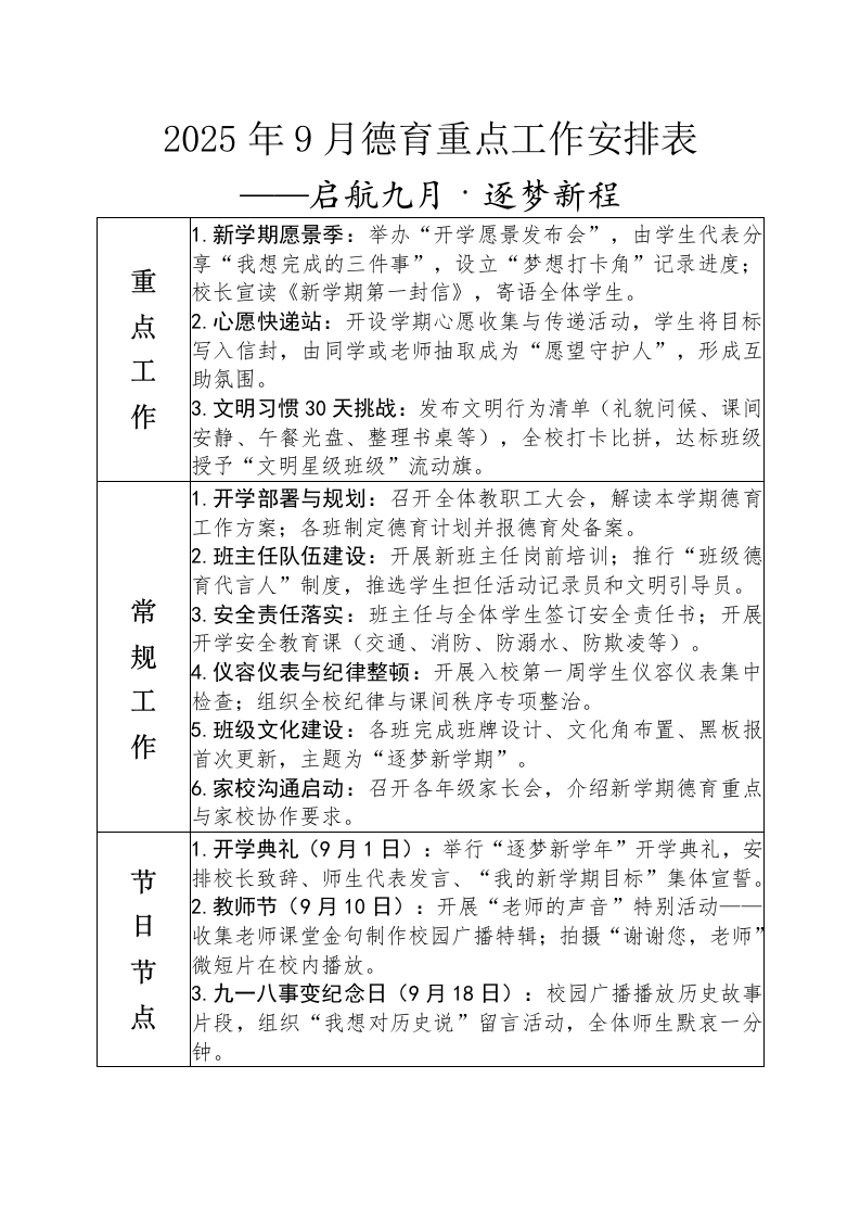 2025年9月德育重点工作安排表启航九月·逐梦新程1.新学期愿景季:举办“开学愿景发布会”,由学生代表分享“我想完成的三件事”,设立“梦想打卡角”记录进度:重校长宣读《新学期第一封信》,寄语全体学生。点2.心愿快递站:开设学期心愿收集与传递活动,学生将目标写入信封,由同学或老师抽取成为“愿望守护人”,形成互工助氛围。作3.文明习惯30天挑战:发布文明行为清单(礼貌问候、课间安静、午餐光盘、整理书桌等),全校打卡比拼,达标班级授予“文明星级班级”流动旗。1.开学部署与规划:召开全体教职工大会,解读本学期德育工作方案;各班制定德育计划并报德育处备案。2.班主任队伍建设:开展新班主任岗前培训;推行“班级德育代言人”制度,推选学生担任活动记录员和文明引导员。常3.安全责任落实:班主任与全体学生签订安全责任书;开展规开学安全教育课(交通、消防、防溺水、防欺凌等)。4.仪容仪表与纪律整顿:开展入校第一周学生仪容仪表集中工检查;组织全校纪律与课间秩序专项整治。5.班级文化建设:各班完成班牌设计、文化角布置、黑板报作首次更新,主题为“逐梦新学期”。6.家校沟通启动:召开各年级家长会,介绍新学期德育重点与家校协作要求。1.开学典礼(9月1日):举行“逐梦新学年”开学典礼,安节排校长致辞、师生代表发言、“我的新学期目标”集体宣誓。2.教师节(9月10日):开展“老师的声音”特别活动日收集老师课堂金句制作校园广播特辑;拍摄“谢谢您,老师”节微短片在校内播放。3.九一八事变纪念日(9月18日):校园广播播放历史故事点片段,组织“我想对历史说”留言活动,全体师生默哀一分钟。