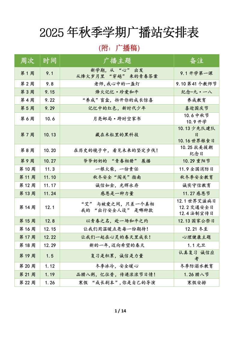 2025年秋季学期广播站安排表(附:广播稿)周次时间广播主题备注第1周9.1新学期,从“心”出发从烽火岁月里“穿越”来的青春答案9.1开学第一课第2周9.8老师,我心中的一盏灯9.10第41个教师节第3周9.15烽火记忆·珍爱和平纪念-九·一八第4周9.22“养成”盲盒,拆开你的成长惊喜第5周9.29记忆中的红色,新时代少年喜迎国庆节10.6中秋节第6周10.6月亮邮局·跨时空家书10.9开学10.13少先队建队第7周10.13藏在米粒里的黑科技日10.16世界粮食日第8周10.20在历史的镜子中,看见未来的坚定步伐!10.25抗美援朝纪念日第9周10.27爷爷奶奶的“青春相册”展播10.29重阳节第10周11.3一根火柴,一份责任11.9全国消防日第11周11.10秋冬安全“闯关”指南秋冬季安全教育第12周11.17诚信如金,光辉永存诚实守信教育第13周11.24感恩是一种力量11.27感恩节“艾”与被爱之间,只差一个真相12.1世界艾滋病日第14周12.1我的“出行安全人设”是哪种款12.2交通安全日12.4法制宣传日第15周12.8以青春之名,赴一场和平之约12.13国家公祭日第16周12.15让我们用温暖点亮每一份期待!12.21冬至第17周12.22让我们一起在心灵的春天里成长!心理健康主题第18周12.29新的一年,迈向希望的春天1.1元旦认真复习诚信应第19周1.5复习是积累,诚信是力量考第20周1.12冬季冰冷,安全暖心冬季防溺水教育第21周1.19品腊八粥,忆往昔,传递浓浓节日情!1.26腊八节第22周1.26寒假“成长剧本”,你是自己的导演寒假安排1/14