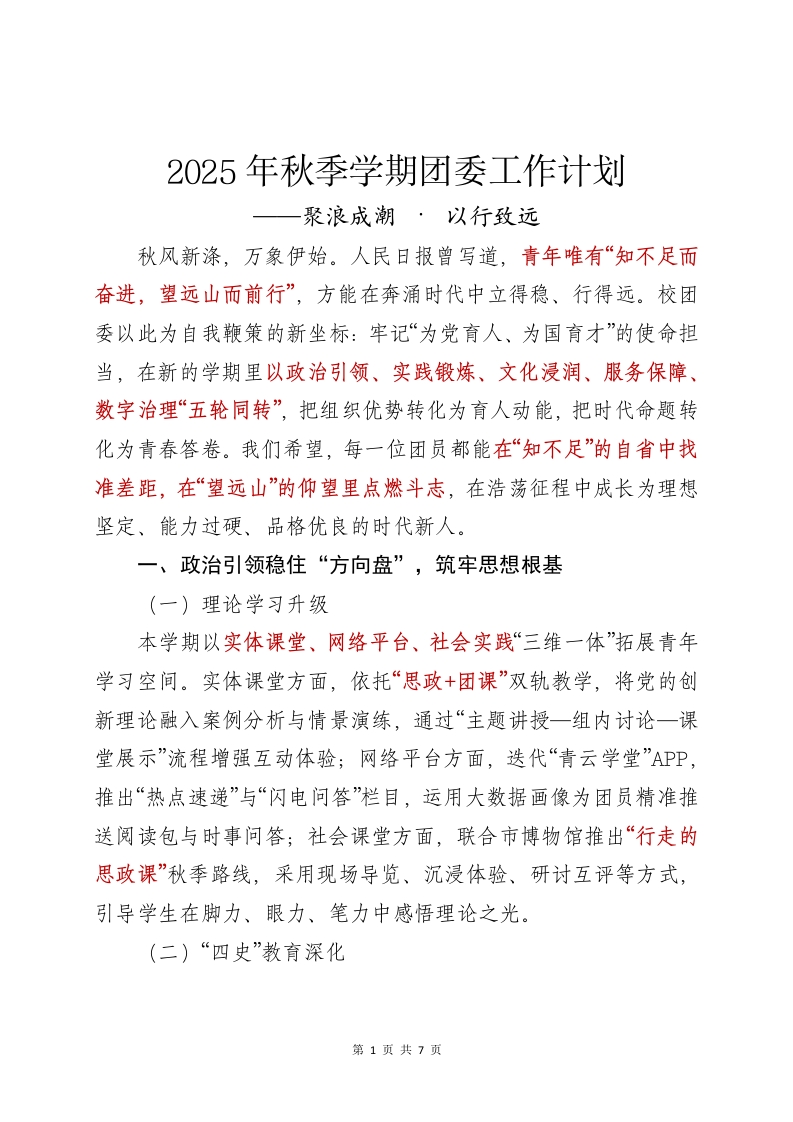 2025年秋季学期团委工作计划一聚浪成潮·以行致远秋风新涤,万象伊始。人民日报曾写道,青年唯有“知不足而奋进,望远山而前行”,方能在奔涌时代中立得稳、行得远。校团委以此为自我鞭策的新坐标:牢记“为党育人、为国育才”的使命担当,在新的学期里以政治引领、实践锻炼、文化浸润、服务保障、数字治理“五轮同转”,把组织优势转化为育人动能,把时代命题转化为青春答卷。我们希望,每一位团员都能在“知不足”的自省中找准差距,在“望远山”的仰望里点燃斗志,在浩荡征程中成长为理想坚定、能力过硬、品格优良的时代新人。一、政治引领稳住“方向盘”,筑牢思想根基(一)理论学习升级本学期以实体课堂、网络平台、社会实践“三维一体”拓展青年学习空间。实体课堂方面,依托“思政+团课”双轨教学,将党的创新理论融入案例分析与情景演练,通过“主题讲授一组内讨论一课堂展示”流程增强互动体验;网络平台方面,迭代“青云学堂”APP,推出“热点速递”与“闪电问答”栏目,运用大数据画像为团员精准推送阅读包与时事问答;社会课堂方面,联合市博物馆推出“行走的思政课”秋季路线,采用现场导览、沉浸体验、研讨互评等方式,引导学生在脚力、眼力、笔力中感悟理论之光。(二)“四史”教育深化第1页共7页