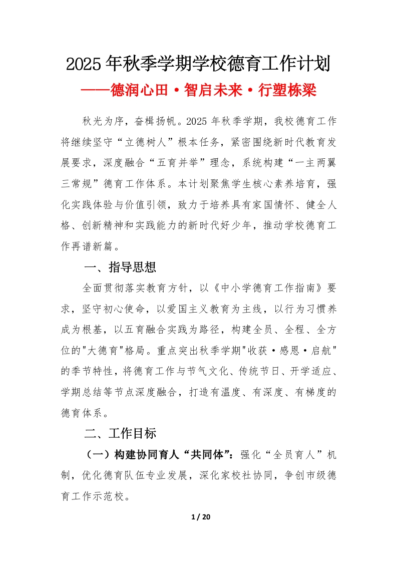 2025年秋季学期学校德育工作计划德润心田·智启未来·行塑栋梁秋光为序,奋楫扬帆。2025年秋季学期,我校德育工作将继续坚守“立德树人”根本任务,紧密围绕新时代教育发展要求,深度融合“五育并举”理念,系统构建“一主两翼三常规”德育工作体系。本计划聚焦学生核心素养培育,强化实践体验与价值引领,致力于培养具有家国情怀、健全人格、创新精神和实践能力的新时代好少年,推动学校德育工作再谱新篇。一、指导思想全面贯彻落实教育方针,以《中小学德育工作指南》要求,坚守初心使命,以爱国主义教育为主线,以行为习惯养成为根基,以五育融合实践为路径,构建全员、全程、全方位的”大德育"格局。重点突出秋季学期"收获·感恩·启航”的季节特性,将德育工作与节气文化、传统节日、开学适应、学期总结等节点深度融合,打造有温度、有深度、有梯度的德育体系。二、工作目标(一)构建协同育人“共同体”:强化“全员育人”机制,优化德育队伍专业发展,深化家校社协同,争创市级德育工作示范校。1/20
