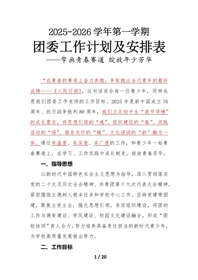 2025-2026学年第一学期团委工作计划及安排表擎画青春赛道绽放年少芳华“在青春的赛道上奋力奔跑,争取跑出当代青年的最好成绩一一《人民日报》,这句话适合每一位青少年,同样也是我们团委工作老师的工作目标。2025年是新中国成立76周年、抗日战争胜利80周年,我们立足初中生“拔节孕穗”的成长需求,将思想引领的“魂”、组织建设的“基”、实践活动的“场”、服务关怀的“暖”、文化浸润的“韵”融为一体。通过有温度、有深度、有广度的工作,和青少年一起青春赛道上,在学习、工作实践中成长蜕变,绽放青春芳华。一、指导思想以新时代中国特色社会主义思想为指导,深入贯彻落实党的二十大及历次全会精神、共青团第十九次代表大会精神,紧密围绕立德树人根本任务和学校中心工作。坚持党建带团建,聚焦主责主业,强化思想引领,夯实组织建设,将团的工作与德育建设、学风建设、校园文化建设融合,形成“团校协同”育人合力。努力培养具备责任担当的新时代青少年,为学校高质量发展做出努力。二、工作目标1/20
