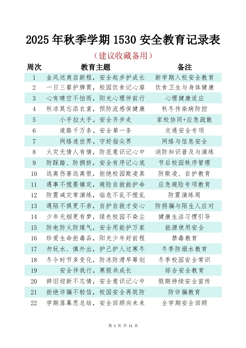 2025年秋季学期1530安全教育记录表(建议收藏备用)周次教育主题备注1金风送爽启新程,安全起步护成长新学期入校安全教育2一日三餐护脾胃,校园饮食记心扉饮食卫生与身体健康3心有晴空不怕雨,阳光心理伴前行心理健康适应4秋凉莫忘添衣裳,预防流感保健康秋冬传染病防控5小手拉大手,安全齐步走家校协同+应急疏散6道路千万条,安全第一条交通安全专项7网络连世界,守好指尖界网络与信息安全8火灾无情人有情,防范意识记心中消防知识普及与演练9防踩踏、防拥挤,安全有序记心底节后校园秩序管理10远离伤害远离恨,拒绝校园欺凌真防欺凌、自护教育11遇事不慌要镇定,避险自救能护命应急避险专项教育12防震减灾常演练,临危不乱不慌乱防震演练周13遇陌不惧更不亲,自护自救才安心防拐骗与陌生人应对14少年无烟更有梦,绿色校园不染尘健康生活习惯引导15防电防火防煤气,安全用能护万家能源使用安全16珍爱生命拒毒品,阳光少年好前程禁毒教育17勿玩水、慎外出,护己护人过寒冬冬季防溺水教育18冬令时节多变化,防冻防滑早筹划冬季校园安全常识19安全伴我行,寒假共成长综合安全教育20辞旧迎新不忘情,安全意识记心中假期持续安全宣传21拒绝诈骗不轻信,校园安全再筑防防诈骗教育22学期落幕思总结,安全回顾向未来全学期安全回顾第1页共11页