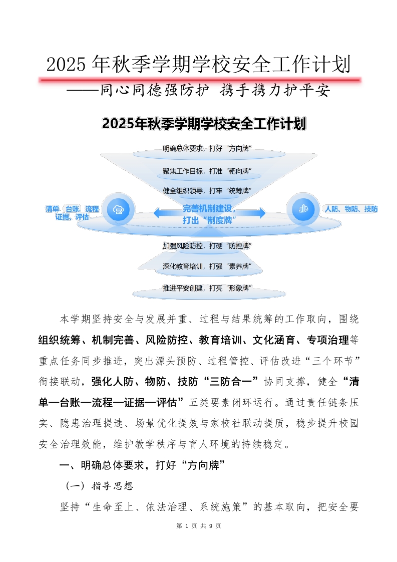 2025年秋季学期学校安全工作计划同心同德强防护携手携力护平安2025年秋季学期学校安全工作计划明确总体要求,打好“方向牌“聚焦工作目标,打准“靶向牌“健全组织领导,打牢“统筹牌”清单〔台账,流程完善机制建设,人防、物防、技防证据、评估打出“制度牌”加强风险防控,打硬"防控牌深化教育培训,打强“素养牌”推进平安创建,打亮“形象牌”本学期坚持安全与发展并重、过程与结果统筹的工作取向,围绕组织统筹、机制完善、风险防控、教育培训、文化涵育、专项治理等重点任务同步推进,突出源头预防、过程管控、评估改进“三个环节”衔接联动,强化人防、物防、技防“三防合一”协同支撑,健全“清单一台账一流程一证据一评估”五类要素闭环运行。通过责任链条压实、隐患治理提速、场景优化提效与家校社联动提质,稳步提升校园安全治理效能,维护教学秩序与育人环境的持续稳定。一、明确总体要求,打好“方向牌”(一)指导思想坚持“生命至上、依法治理、系统施策”的基本取向,把安全要第1页共9页