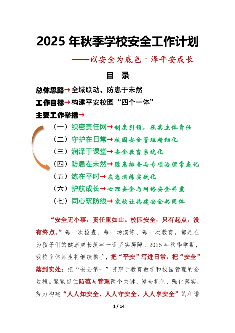 2025年秋季学校安全工作计划—以安全为底色·泽平安成长目录总体思路→全域联动,防患于未然工作目标→构建平安校园“四个一体”主要工作举措→(一)织密责任网→制度引领,压实主体责任(二)守护在日常→校园安全管理精细化(三)润泽于课堂→安全教育条统化(四)防患在未然→隐患排查与专项治理常态化(五)练在平时→应急演练实战化(六)护航成长→心理安全与网络安全并重(七)同心筑防线→家校社共建安全共同体“安全无小事,责任重如山。校园安全,只有起点,没有终点。”每一次检查、每一场演练、每一次教育,都是在为孩子们的健康成长筑牢一道坚实屏障。2025年秋季学期,我校全体师生将继续携手,把“平安”写进日常,把“安全”落到实处;把“安全第一”贯穿于教育教学和校园管理的全过程。紧紧抓住防范与管理两个关键,健全机制、强化落实,努力构建“人人知安全、人人守安全、人人享安全”的和谐1/14