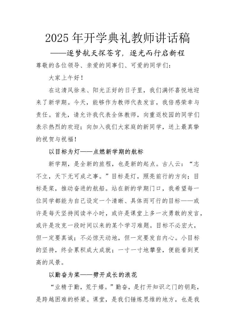 2025年开学典礼教师讲话稿一逐梦航天探苍官,逐光而行启新程尊敬的各位领导、亲爱的同事们、可爱的同学们:大家上午好!在这清风徐来、阳光正好的日子里,我们满怀喜悦地迎来了新学期。今天,能够作为教师代表发言,我倍感荣幸与责任。首先,请允许我代表全体教师,向重返校园的同学们表示热烈的欢迎;向加入我们大家庭的新同学,送上最真挚的祝贺与祝福!以目标为灯一一点燃新学期的航标新学期,是全新的旅程,也是新的起点。古人云:“志不立,天下无可成之事。”目标是灯,照亮前行的方向;目标是桨,推动奋进的航船。站在新的学期门口,我希望每一位同学都能为自己设定一个清晰、具体而可行的目标一一或许是每天坚持阅读半小时,或许是课堂上多一次勇敢的发言,或许是攻克一段时间以来的某个学习难题。目标不必宏大,但一定要真诚;不必惊天动地,但一定要发自内心。小目标的坚持,终会累积成大成就;一寸一寸地攀登,便能看到更高的风景。以勤奋为桨一一劈开成长的浪花“业精于勤,荒于嬉。”勤奋,是打开知识之门的钥匙,是跨越困难的桥梁。课堂,是我们锤炼思维的地方,也是我
