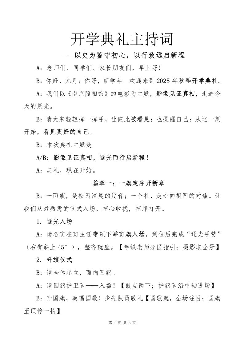 开学典礼主持词以史为鉴守初心,以行致远启新程A:老师们、同学们、家长朋友们,早上好!B:你好,九月;你好,新学年。欢迎来到2025年秋季开学典礼。A:我们以《南京照相馆》的电影为主题,影像见证真相,走进今天的晨光。B:请大家轻轻挥一挥手,让彼此被看见;也提醒自己:从这一刻开始,看见更好的自己。B:本次典礼主题是A/B:影像见证真相,逐光而行启新程!A:典礼,现在开始。篇章一:一旗定序开新章B:一面旗,是校园清晨的定音;一个礼,是心向祖国的对焦。让我们从最熟悉的仪式入场,把心收拢,把序打开。1.逐光入场A:请各班在班主任带领下举班旗入场,到位后完成“逐光手势”(右臂斜上45°),整齐就座。【年级老师分区指引;摄影取全景】2.升旗仪式B:请全体起立,面向国旗。A:请国旗护卫队一一入场!【鼓点两下;护旗队沿中轴进场】B:升国旗,奏唱国歌!少先队员敬礼【国歌起,全场注目;国旗至顶停一拍】第1页共8页