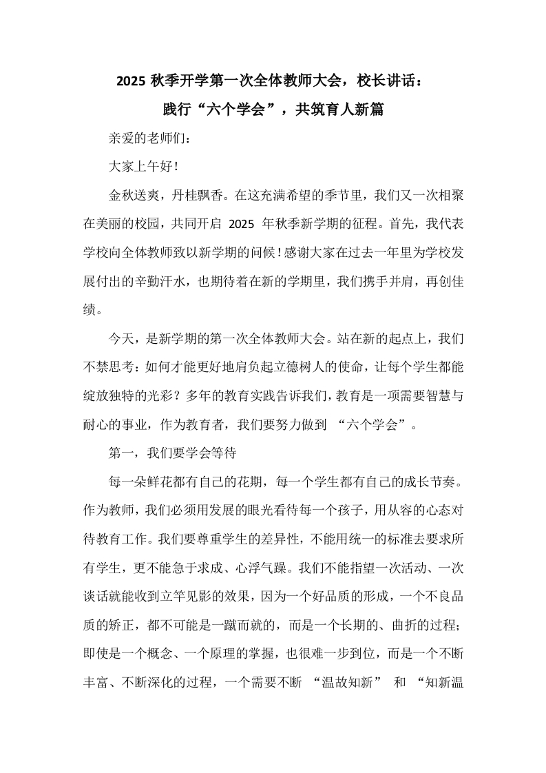 2025秋季开学第一次全体教师大会,校长讲话:践行“六个学会”,共筑育人新篇亲爱的老师们:大家上午好!金秋送爽,丹桂飘香。在这充满希望的季节里,我们又一次相聚在美丽的校园,共同开启2025年秋季新学期的征程。首先,我代表学校向全体教师致以新学期的问候!感谢大家在过去一年里为学校发展付出的辛勤汗水,也期待着在新的学期里,我们携手并肩,再创佳绩。今天,是新学期的第一次全体教师大会。站在新的起点上,我们不禁思考:如何才能更好地肩负起立德树人的使命,让每个学生都能绽放独特的光彩?多年的教育实践告诉我们,教育是一项需要智慧与耐心的事业,作为教育者,我们要努力做到“六个学会”。第一,我们要学会等待每一朵鲜花都有自己的花期,每一个学生都有自己的成长节奏。作为教师,我们必须用发展的眼光看待每一个孩子,用从容的心态对待教育工作。我们要尊重学生的差异性,不能用统一的标准去要求所有学生,更不能急于求成、心浮气躁。我们不能指望一次活动、一次谈话就能收到立竿见影的效果,因为一个好品质的形成,一个不良品质的矫正,都不可能是一蹴而就的,而是一个长期的、曲折的过程:即使是一个概念、一个原理的掌握,也很难一步到位,而是一个不断丰富、不断深化的过程,一个需要不断“温故知新”和“知新温