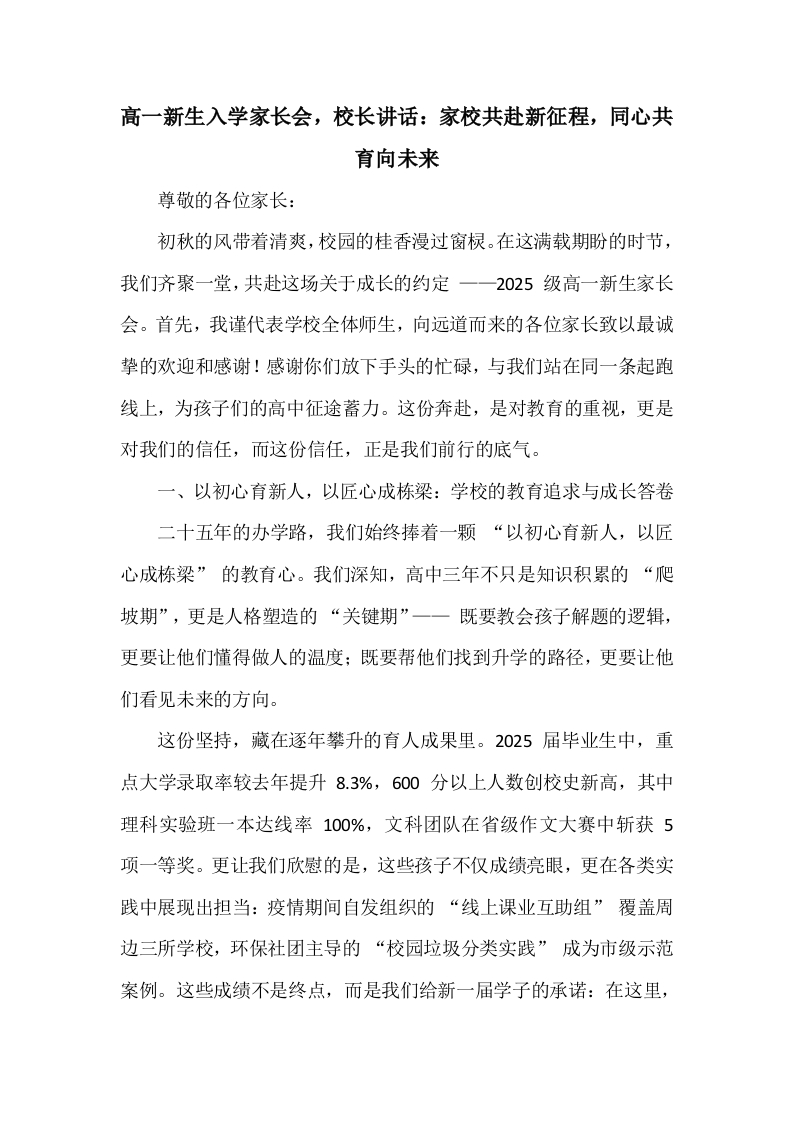 高一新生入学家长会,校长讲话:家校共赴新征程,同心共育向未来尊敬的各位家长:初秋的风带着清爽,校园的桂香漫过窗棂。在这满载期盼的时节,我们齐聚一堂,共赴这场关于成长的约定一一2025级高一新生家长会。首先,我谨代表学校全体师生,向远道而来的各位家长致以最诚挚的欢迎和感谢!感谢你们放下手头的忙碌,与我们站在同一条起跑线上,为孩子们的高中征途蓄力。这份奔赴,是对教育的重视,更是对我们的信任,而这份信任,正是我们前行的底气。一、以初心育新人,以匠心成栋梁:学校的教育追求与成长答卷二十五年的办学路,我们始终捧着一颗“以初心育新人,以匠心成栋梁”的教育心。我们深知,高中三年不只是知识积累的“爬坡期”,更是人格塑造的“关键期”一一既要教会孩子解题的逻辑,更要让他们懂得做人的温度:既要帮他们找到升学的路径,更要让他们看见未来的方向。这份坚持,藏在逐年攀升的育人成果里。2025届毕业生中,重点大学录取率较去年提升8.3%,600分以上人数创校史新高,其中理科实验班一本达线率100%,文科团队在省级作文大赛中斩获5项一等奖。更让我们欣慰的是,这些孩子不仅成绩亮眼,更在各类实践中展现出担当:疫情期间自发组织的“线上课业互助组”覆盖周边三所学校,环保社团主导的“校园垃圾分类实践”成为市级示范案例。这些成绩不是终点,而是我们给新一届学子的承诺:在这里,