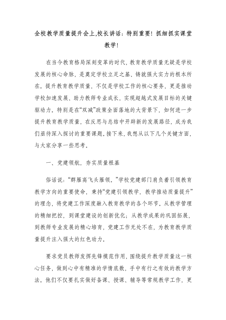 全校教学质量提升会上,校长讲话:特别重要!抓细抓实课堂在当今教育格局深刻变革的时代,教育教学质量无疑是学校发展的核心命脉,是奠定学校立足之基、铸就强大实力的根本所在。提升教育教学质量,不仅是学校工作的核心要务,更是推动学校加速发展、助力教师专业成长,实现超越式发展目标的关键驱动力。特别是在“双减”政策全面落地的大背景下,如何进一步提升教育教学质量,在反思与总结中开辟新的发展路径,成为我们亟待深入探讨的重要课题。接下来,我想从以下几个关键方面,与大家分享一些思考。一、党建领航,夯实质量根基俗话说:“群雁高飞头雁领。”学校党建部门肩负着引领教育教学方向的重要使命,秉持“党建引领教学,教学推动质量提升”的理念,将党建工作深度融入教育教学的各个环节。从教学管理的精细把控,到课堂建设的创新优化;从教学成果的巩固拓展,到教师专业发展的精心培育,党建工作无处不在,为教育教学质量提升注入强大的红色动力。要求党员教师发挥先锋模范作用,围绕提升教学质量这一核心任务,做到心中有精准的学情底数,手中有行之有效的教学方法。他们不仅要扎实做好备课、授课、辅导等常规教学工作,更