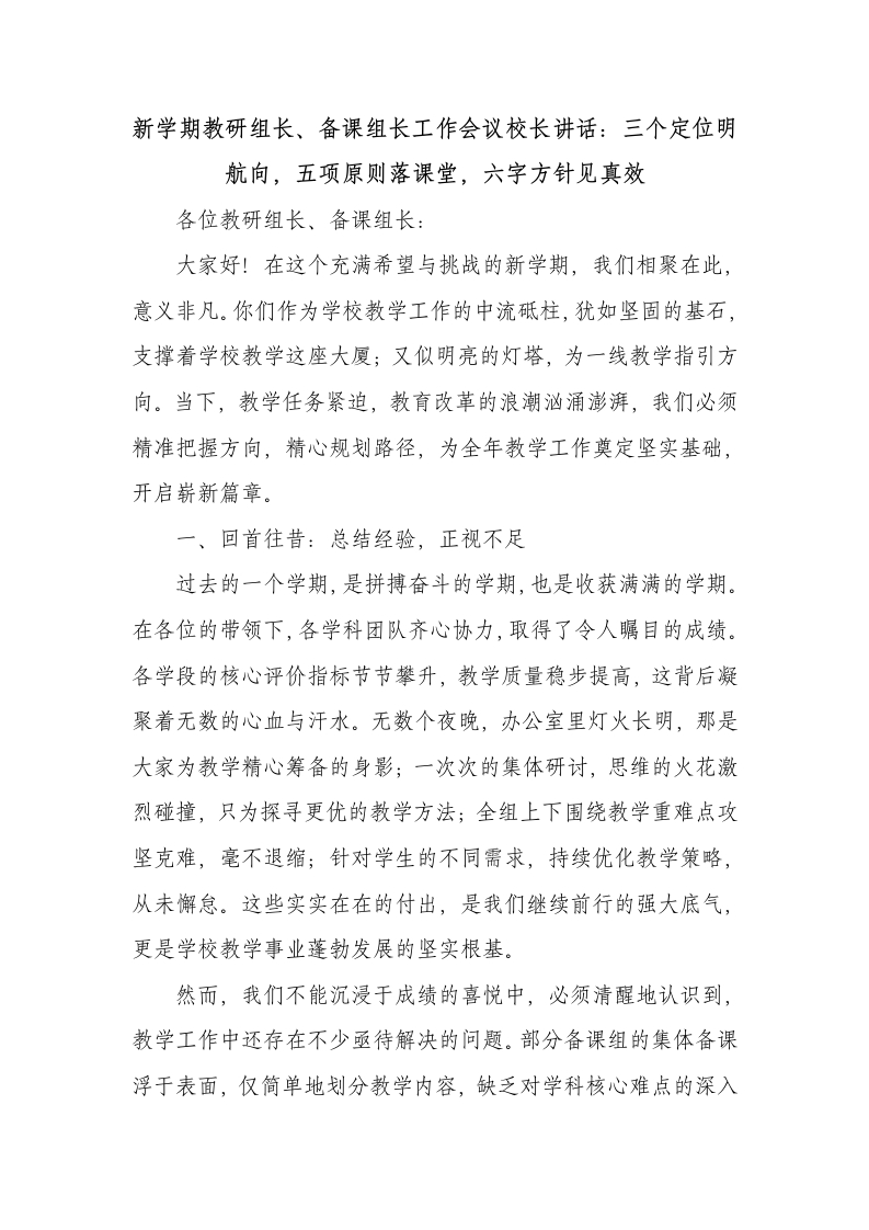 新学期教研组长、备课组长工作会议校长讲话:三个定位明航向,五项原则落课堂,六字方针见真效各位教研组长、备课组长:大家好!在这个充满希望与挑战的新学期,我们相聚在此,意义非凡。你们作为学校教学工作的中流砥柱,犹如坚固的基石,支撑着学校教学这座大厦;又似明亮的灯塔,为一线教学指引方向。当下,教学任务紧迫,教育改革的浪潮汹涌澎湃,我们必须精准把握方向,精心规划路径,为全年教学工作奠定坚实基础,开启崭新篇章。一、回首往昔:总结经验,正视不足过去的一个学期,是拼搏奋斗的学期,也是收获满满的学期。在各位的带领下,各学科团队齐心协力,取得了令人瞩目的成绩。各学段的核心评价指标节节攀升,教学质量稳步提高,这背后凝聚着无数的心血与汗水。无数个夜晚,办公室里灯火长明,那是大家为教学精心筹备的身影;一次次的集体研讨,思维的火花激烈碰撞,只为探寻更优的教学方法;全组上下围绕教学重难点攻坚克难,毫不退缩;针对学生的不同需求,持续优化教学策略,从未懈怠。这些实实在在的付出,是我们继续前行的强大底气,更是学校教学事业蓬勃发展的坚实根基。然而,我们不能沉浸于成绩的喜悦中,必须清醒地认识到,教学工作中还存在不少亟待解决的问题。部分备课组的集体备课浮于表面,仅简单地划分教学内容,缺乏对学科核心难点的深入