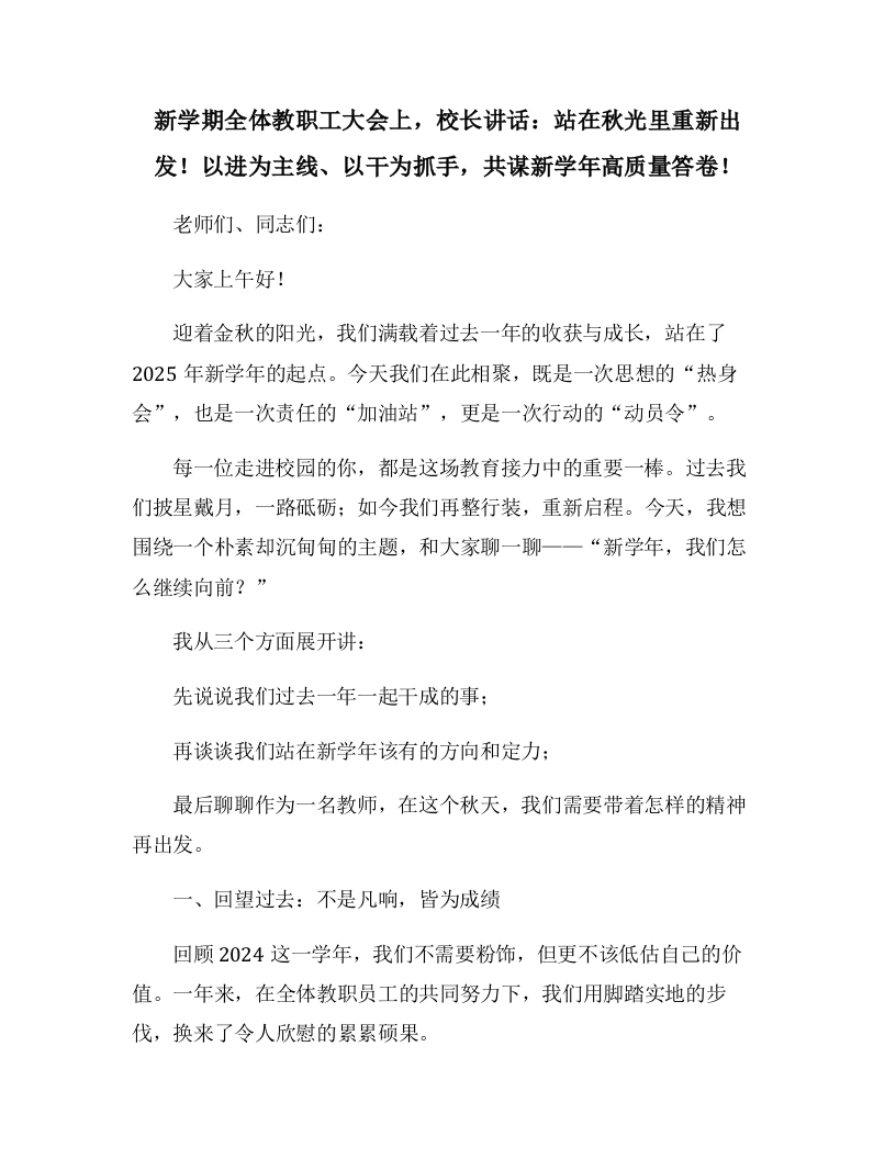 新学期全体教职工大会上,校长讲话:站在秋光里重新出发!以进为主线、以干为抓手,共谋新学年高质量答卷!老师们、同志们:大家上午好!迎着金秋的阳光,我们满载着过去一年的收获与成长,站在了2025年新学年的起点。今天我们在此相聚,既是一次思想的“热身会”,也是一次责任的“加油站”,更是一次行动的“动员令”。每一位走进校园的你,都是这场教育接力中的重要一棒。过去我们披星戴月,一路砥砺;如今我们再整行装,重新启程。今天,我想围绕一个朴素却沉甸甸的主题,和大家聊一聊一一“新学年,我们怎么继续向前?”我从三个方面展开讲:先说说我们过去一年一起干成的事:再谈谈我们站在新学年该有的方向和定力:最后聊聊作为一名教师,在这个秋天,我们需要带着怎样的精神再出发。一、回望过去:不是凡响,皆为成绩回顾2024这一学年,我们不需要粉饰,但更不该低估自己的价值。一年来,在全体教职员工的共同努力下,我们用脚踏实地的步伐,换来了令人欣慰的累累硕果。