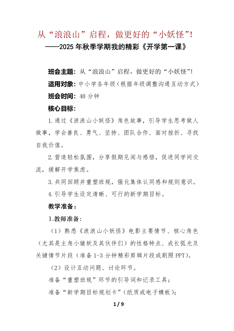 从“浪浪山”启程,做更好的“小妖怪”!-2025年秋季学期我的精彩《开学第一课》班会主题:从“浪浪山”启程,做更好的“小妖怪”!适用对象:中小学各年级(根据年级调整沟通互动方式)班会时间:40分钟核心目标:1.通过《浪浪山小妖怪》角色故事,引导学生思考做人做事,学会善良、勇气、坚持、团队合作、面对挫折、寻找自我价值。2.营造轻松氛围,分享假期见闻与感悟,促进同学间交流,缓解开学焦虑。3.共同回顾并重塑班规,强化集体认同感和规则意识。4.引导学生设定清晰、可行的新学期目标。教学准备:1.教师准备:(1)熟悉《浪浪山小妖怪》电影主要情节、核心角色(尤其是主角小猪妖及其伙伴们)的性格特点、成长弧光及关键情节片段(准备1-3分钟精彩剪辑片段或剧照PPT)。(2)设计互动问题、讨论环节。准备“重塑班规”环节的引导词和记录工具:准备“新学期目标规划卡”(纸质或电子模板):1/9