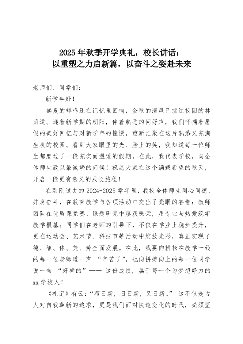 2025年秋季开学典礼,校长讲话:以重塑之力启新篇,以奋斗之姿赴未来老师们、同学们:新学年好!盛夏的蝉鸣还在记忆里回响,金秋的清风已拂过校园的林荫道。迎着新学期的朝阳,伴着熟悉的问好声,我们怀揣着暑假的美好回忆与对新学年的憧憬,重新汇聚在这片熟悉又充满生机的校园。看到大家眼里的光、脸上的笑,我知道每一位师生都度过了一段充实而温暖的假期。在此,我代表学校,向全体师生致以最诚挚的问候!祝愿大家在这个满载希望的秋天,开启一段更有意义的成长旅程!在刚刚过去的2024-2025学年里,我校全体师生同心同德、并肩奋斗,在教育教学与各项活动中交出了亮眼的答卷:教师团队在优质课竞赛、课题研究中屡获殊荣,用专业与热爱筑牢教学根基;同学们在老师的引导下,不仅在学业上稳步提升,更在运动会、艺术节、科技节等活动中绽放光彩,真正实现了德、智、体、美、劳全面发展。在此,我要向耕耘在教学一线的每一位老师道一声“辛苦了”,也向拼搏向上的每一位同学说一句“好样的”一一这份成绩,属于每一个为梦想努力的《礼记》有云:“苟日新,日日新,又日新。”这不仅是古人对自我革新的追求,更是我们面对快速变化的时代,必须坚