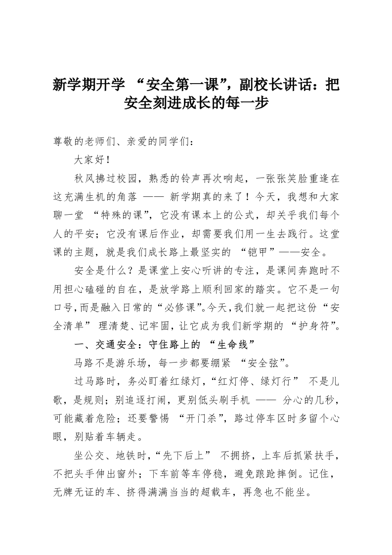 新学期开学“安全第一课”,副校长讲话:把安全刻进成长的每一步尊敬的老师们、亲爱的同学们:大家好!秋风拂过校园,熟悉的铃声再次响起,一张张笑脸重逢在这充满生机的角落一一新学期真的来了!今天,我想和大家聊一堂“特殊的课”,它没有课本上的公式,却关乎我们每个人的平安;它没有课后作业,却需要我们用一生去践行。这堂课的主题,就是我们成长路上最坚实的“铠甲”一一安全。安全是什么?是课堂上安心听讲的专注,是课间奔跑时不用担心磕碰的自在,是放学路上顺利回家的踏实。它不是一句口号,而是融入日常的“必修课”。今天,我们就一起把这份“安全清单”理清楚、记牢固,让它成为我们新学期的“护身符”。一、交通安全:守住路上的“生命线”马路不是游乐场,每一步都要绷紧“安全弦”。过马路时,务必盯着红绿灯,“红灯停、绿灯行”不是儿歌,是规则;别追逐打闹,更别低头刷手机一一分心的几秒,可能藏着危险;还要警惕“开门杀”,路过停车区时多留个心眼,别贴着车辆走。坐公交、地铁时,“先下后上”不拥挤,上车后抓紧扶手,不把头手伸出窗外;下车前等车停稳,避免踉跄摔倒。记住,无牌无证的车、挤得满满当当的超载车,再急也不能坐。