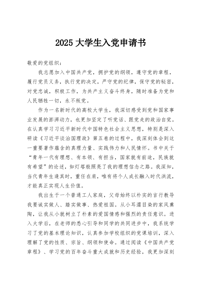 2025大学生入党申请书敬爱的党组织:我志愿加入中国共产党,拥护党的纲领,遵守党的章程,履行党员义务,执行党的决定,严守党的纪律,保守党的秘密,对党忠诚,积极工作,为共产主义奋斗终身,随时准备为党和人民牺牲一切,永不叛党。作为一名新时代的高校大学生,我深切感受到党和国家事业发展的澎湃动力,也更加坚定了听党话、跟党走的政治自觉。在认真学习习近平新时代中国特色社会主义思想,特别是深入研读《习近平谈治国理政》第五卷的过程中,我深刻体会到这一重要著作蕴含的真理力量、实践伟力和人民情怀。书中关于“青年一代有理想、有本领、有担当,国家就有前途,民族就有希望”的论述,如灯塔般照亮了我的理想信念之路。我深知,当代青年生逢其时,重任在肩,唯有将个人成长融入时代洪流,才能真正实现人生价值。我出生于一个普通工人家庭,父母始终以朴实的言行教导我要诚实做人、踏实做事、热爱祖国。从小耳濡目染的家风熏陶,让我从小就树立了朴素的爱国情感和强烈的责任意识。进入大学后,在老师的悉心引导和同学的共同进步中,我系统学习了党的基本理论知识,认真参加学校组织的党课培训,深入理解了党的性质、宗旨、纲领和使命。通过阅读《中国共产党章程》、学习党的百年奋斗重大成就和历史经验,我更加深刻