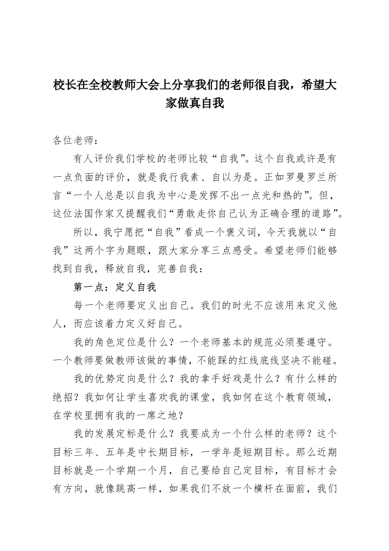 校长在全校教师大会上分享我们的老师很自我,希望大家做真自我各位老师:有人评价我们学校的老师比较“自我”。这个自我或许是有一点负面的评价,就是我行我素、自以为是。正如罗曼罗兰所言“一个人总是以自我为中心是发挥不出一点光和热的”。但,这位法国作家又提醒我们“勇敢走你自己认为正确合理的道路”。所以,我宁愿把“自我”看成一个褒义词,今天我就以“自我”这两个字为题眼,跟大家分享三点感受。希望老师们能够找到自我,释放自我,完善自我:第一点:定义自我每一个老师要定义出自己。我们的时光不应该用来定义他人,而应该着力定义好自己。我的角色定位是什么?一个老师基本的规范必须要遵守。一个教师要做教师该做的事情,不能踩的红线底线坚决不能碰。我的优势定向是什么?我的拿手好戏是什么?有什么样的绝招?我如何让学生喜欢我的课堂,我如何在这个教育领域,在学校里拥有我的一席之地?我的发展定标是什么?我要成为一个什么样的老师?这个目标三年、五年是中长期目标,一学年是短期目标。那么近期目标就是一个学期一个月,自己要给自己定目标,有目标才会有方向,就像跳高一样,如果我们不放一个横杆在面前,我们