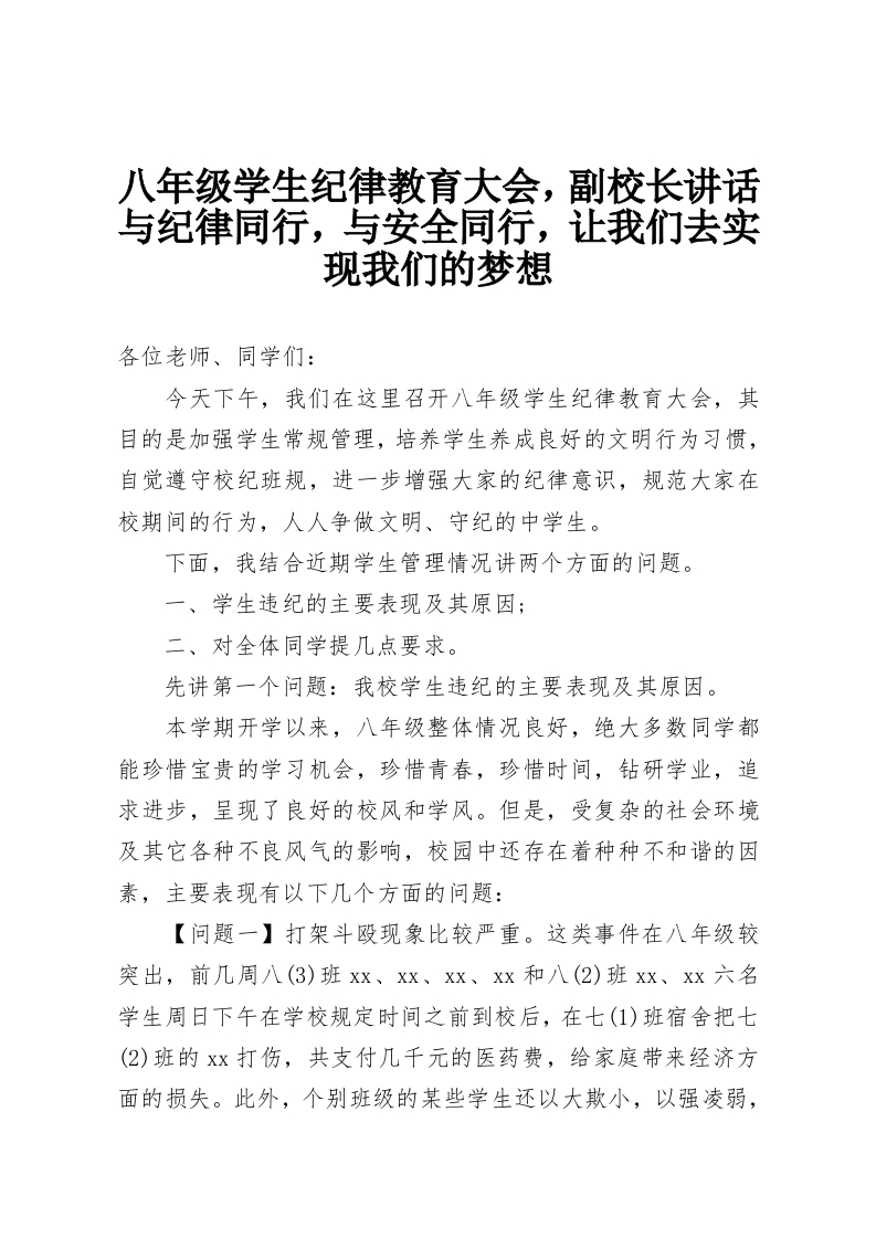 八年级学生纪律教育大会,副校长讲话与纪律同行,与安全同行,让我们去实现我们的梦想各位老师、同学们:今天下午,我们在这里召开八年级学生纪律教育大会,其目的是加强学生常规管理,培养学生养成良好的文明行为习惯,自觉遵守校纪班规,进一步增强大家的纪律意识,规范大家在校期间的行为,人人争做文明、守纪的中学生。下面,我结合近期学生管理情况讲两个方面的问题。一、学生违纪的主要表现及其原因;二、对全体同学提几点要求。先讲第一个问题:我校学生违纪的主要表现及其原因。本学期开学以来,八年级整体情况良好,绝大多数同学都能珍惜宝贵的学习机会,珍惜青春,珍惜时间,钻研学业,追求进步,呈现了良好的校风和学风。但是,受复杂的社会环境及其它各种不良风气的影响,校园中还存在着种种不和谐的因素,主要表现有以下几个方面的问题:【问题一】打架斗殴现象比较严重。这类事件在八年级较学生周日下午在学校规定时间之前到校后,在七(1)班宿舍把七(2)班的xx打伤,共支付几千元的医药费,给家庭带来经济方面的损失。此外,个别班级的某些学生还以大欺小,以强凌弱,