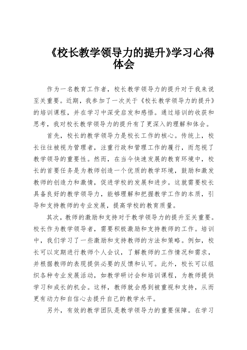 《校长教学领导力的提升》学习心得体会作为一名教育工作者,校长教学领导力的提升对于我来说至关重要。近期,我参加了一次关于《校长教学领导力的提升》的培训课程,并在学习中深受启发和感悟。通过培训的收获和思考,我对校长教学领导力的提升有了更深入的理解和体会。首先,校长的教学领导力是校长工作的核心。传统上,校长往往被视为管理者,注重行政和管理工作的履行,而忽视了教学领导的重要性。然而,在当今快速发展的教育环境中,校长的首要任务是为教师创造一个优质的教学环境,鼓励和激发教师的创造力和激情,促进学校的发展和进步。这就需要校长具备良好的教学领导力,能够理解和把握教学工作的本质,引导和支持教师的专业发展,提高学校的教育质量。其次,教师的激励和支持对于教学领导力的提升至关重要。校长作为教学领导者,需要积极激励和支持教师的工作。培训中,我们学习了一些激励和支持教师的方法和策略。例如,校长可以定期进行教师个人会议,了解教师的工作情况和需求,并根据教师的表现提供必要的反馈和认可。此外,校长可以组织各种专业发展活动,如教学研讨会和培训课程,为教师提供学习和成长的机会。这样,教师就会感到被重视和支持,从而更有动力和自信心去提升自己的教学水平。另外,有效的教学团队是教学领导力的重要保障。在学习