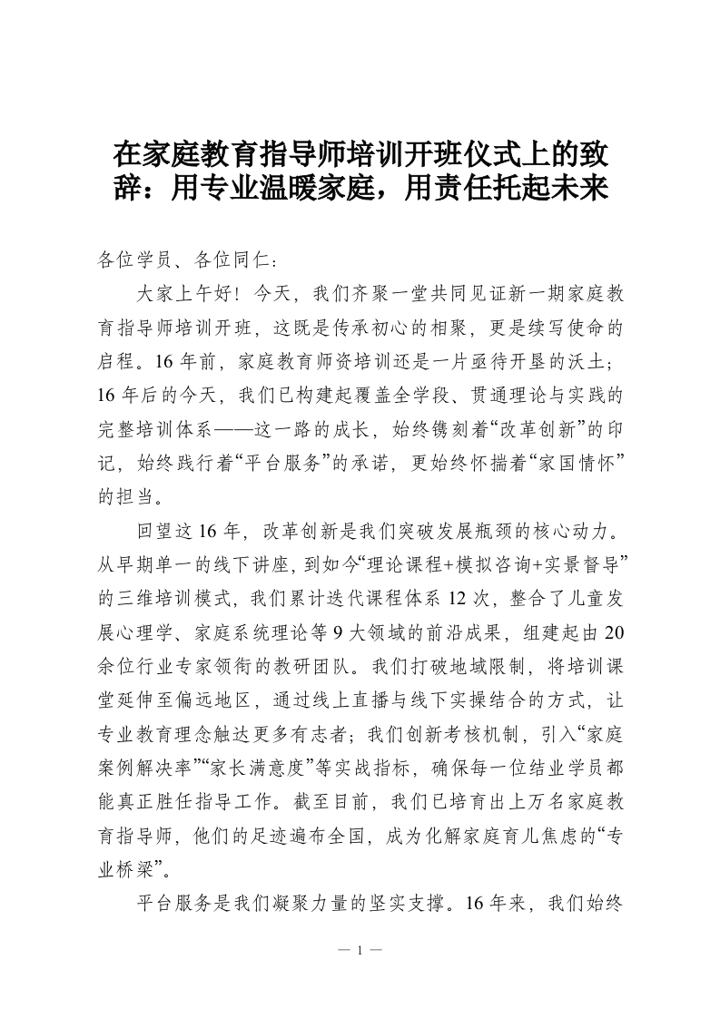 在家庭教育指导师培训开班仪式上的致辞:用专业温暖家庭,用责任托起未来各位学员、各位同仁:大家上午好!今天,我们齐聚一堂共同见证新一期家庭教育指导师培训开班,这既是传承初心的相聚,更是续写使命的启程。16年前,家庭教育师资培训还是一片亟待开垦的沃土;16年后的今天,我们已构建起覆盖全学段、贯通理论与实践的完整培训体系一一这一路的成长,始终镌刻着“改革创新”的印记,始终践行着“平台服务”的承诺,更始终怀揣着“家国情怀”的担当。回望这16年,改革创新是我们突破发展瓶颈的核心动力。从早期单一的线下讲座,到如今“理论课程+模拟咨询+实景督导”的三维培训模式,我们累计迭代课程体系12次,整合了儿童发展心理学、家庭系统理论等9大领域的前沿成果,组建起由20余位行业专家领衔的教研团队。我们打破地域限制,将培训课堂延伸至偏远地区,通过线上直播与线下实操结合的方式,让专业教育理念触达更多有志者;我们创新考核机制,引入“家庭案例解决率”“家长满意度”等实战指标,确保每一位结业学员都能真正胜任指导工作。截至目前,我们已培育出上万名家庭教育指导师,他们的足迹遍布全国,成为化解家庭育儿焦虑的“专业桥梁”。平台服务是我们凝聚力量的坚实支撑。16年来,我们始终1