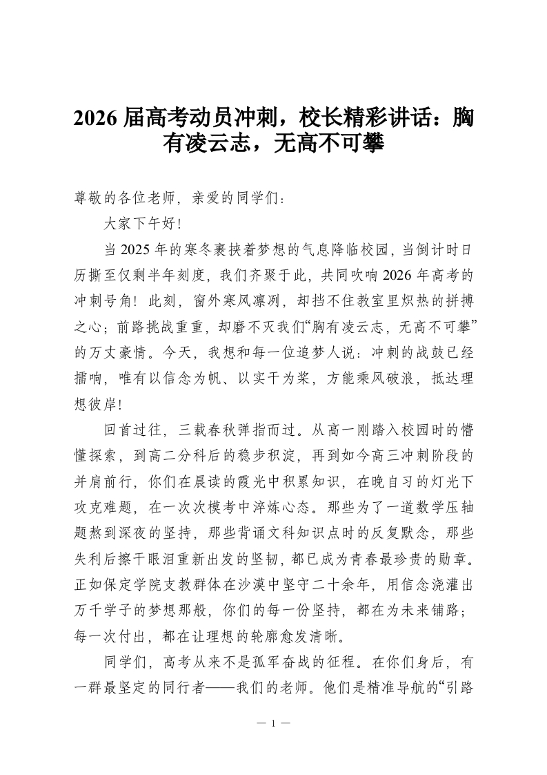 2026届高考动员冲刺,校长精彩讲话:胸有凌云志,无高不可攀尊敬的各位老师,亲爱的同学们:大家下午好!当2025年的寒冬裹挟着梦想的气息降临校园,当倒计时日历撕至仅剩半年刻度,我们齐聚于此,共同吹响2026年高考的冲刺号角!此刻,窗外寒风凛冽,却挡不住教室里炽热的拼搏之心;前路挑战重重,却磨不灭我们“胸有凌云志,无高不可攀”的万丈豪情。今天,我想和每一位追梦人说:冲刺的战鼓已经擂响,唯有以信念为帆、以实干为桨,方能乘风破浪,抵达理想彼岸!回首过往,三载春秋弹指而过。从高一刚踏入校园时的懵懂探索,到高二分科后的稳步积淀,再到如今高三冲刺阶段的并肩前行,你们在晨读的霞光中积累知识,在晚自习的灯光下攻克难题,在一次次模考中淬炼心态。那些为了一道数学压轴题熬到深夜的坚持,那些背诵文科知识点时的反复默念,那些失利后擦干眼泪重新出发的坚韧,都已成为青春最珍贵的勋章。正如保定学院支教群体在沙漠中坚守二十余年,用信念浇灌出万千学子的梦想那般,你们的每一份坚持,都在为未来铺路;每一次付出,都在让理想的轮廓愈发清晰。同学们,高考从来不是孤军奋战的征程。在你们身后,有一群最坚定的同行者一我们的老师。他们是精准导航的“引路1