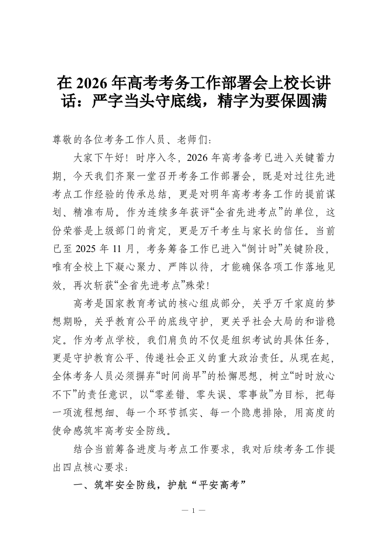 在2026年高考考务工作部署会上校长讲话:严字当头守底线,精字为要保圆满尊敬的各位考务工作人员、老师们:大家下午好!时序入冬,2026年高考备考已进入关键蓄力期,今天我们齐聚一堂召开考务工作部署会,既是对过往先进考点工作经验的传承总结,更是对明年高考考务工作的提前谋划、精准布局。作为连续多年获评“全省先进考点”的单位,这份荣誉是上级部门的肯定,更是万千考生与家长的信任。当前已至2025年11月,考务筹备工作已进入“倒计时”关键阶段,唯有全校上下凝心聚力、严阵以待,才能确保各项工作落地见效,再次斩获“全省先进考点”殊荣!高考是国家教育考试的核心组成部分,关乎万千家庭的梦想期盼,关乎教育公平的底线守护,更关乎社会大局的和谐稳定。作为考点学校,我们肩负的不仅是组织考试的具体任务,更是守护教育公平、传递社会正义的重大政治责任。从现在起,全体考务人员必须摒弃“时间尚早”的松懈思想,树立“时时放心不下”的责任意识,以“零差错、零失误、零事故”为目标,把每一项流程想细、每一个环节抓实、每一个隐患排除,用高度的使命感筑牢高考安全防线。结合当前筹备进度与考点工作要求,我对后续考务工作提出四点核心要求:一、筑牢安全防线,护航“平安高考”1