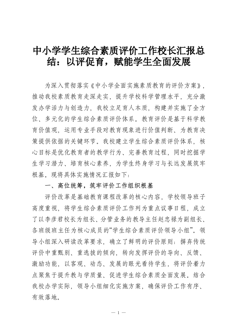 中小学学生综合素质评价工作校长汇报总结:以评促育,赋能学生全面发展为深入贯彻落实《中小学全面实施素质教育的评价方案》,推动我校素质教育走深走实,提升学校科学管理水平,充分激发办学活力与创造力,我校立足育人本质,构建并实施了全方位、多元化的学生综合素质评价体系。教育评价是基于科学教育价值观,运用专业手段对教育现象进行价值判断、为教育决策提供依据的关键环节。我校建立学生综合素质评价体系,核心目标是优化教育者的教学行为、完善教育过程,同时挖掘学生学习潜力、培育核心素养,为学生终身学习与长远发展筑牢根基。现将具体实施情况汇报如下:一、高位统筹,筑牢评价工作组织根基评价改革是基础教育课程改革的核心内容,学校领导班子高度重视,将学生综合素质评价工作列为重点议事日程,成立了以李彦君校长为组长、分管业务的教导主任赵忠禄为副组长、各班级班主任为核心成员的“学生综合素质评价领导小组”。领导小组深入研读改革要求,确立了鲜明的评价原则:摒弃传统评价中重甄别、重选拔的倾向,转向发挥评价的导向、反馈、激励功能,以客观、动态、发展的眼光看待学生,将评价着力点聚焦于提升教与学质量、促进学生综合素质全面发展。结合我校办学实际,领导小组细化实施方案,确保评价工作有序、有效落地。1