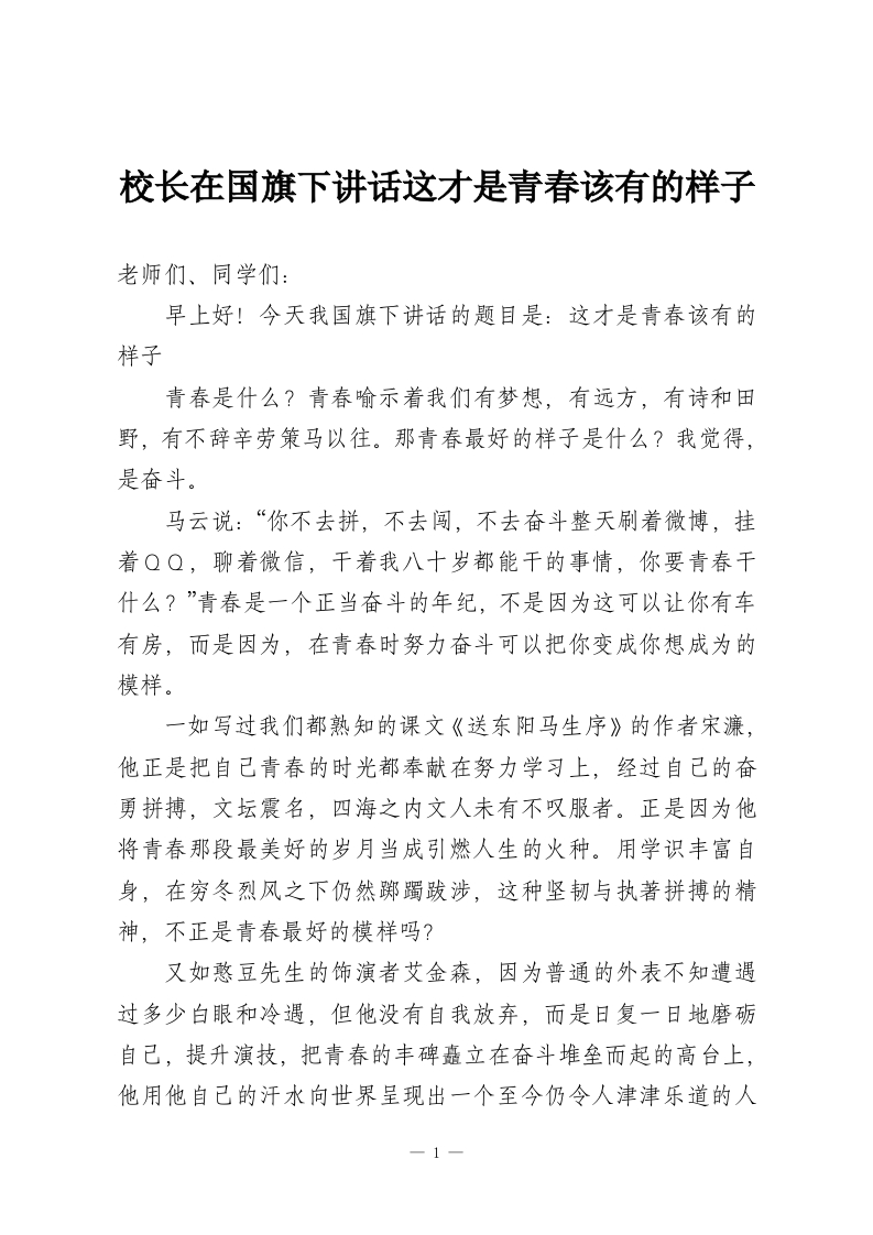 校长在国旗下讲话这才是青春该有的样子老师们、同学们早上好!今天我国旗下讲话的题目是:这才是青春该有的样子青春是什么?青春喻示着我们有梦想,有远方,有诗和田野,有不辞辛劳策马以往。那青春最好的样子是什么?我觉得,是奋斗。马云说:“你不去拼,不去闯,不去奋斗整天刷着微博,挂着QQ,聊着微信,干着我八十岁都能干的事情,你要青春干什么?”青春是一个正当奋斗的年纪,不是因为这可以让你有车有房,而是因为,在青春时努力奋斗可以把你变成你想成为的模样。一如写过我们都熟知的课文《送东阳马生序》的作者宋濂,他正是把自己青春的时光都奉献在努力学习上,经过自己的奋勇拼搏,文坛震名,四海之内文人未有不叹服者。正是因为他将青春那段最美好的岁月当成引燃人生的火种。用学识丰富自身,在穷冬烈风之下仍然踯躅跋涉,这种坚韧与执著拼搏的精神,不正是青春最好的模样吗?又如憨豆先生的饰演者艾金森,因为普通的外表不知遭遇过多少白眼和冷遇,但他没有自我放弃,而是日复一日地磨砺自己,提升演技,把青春的丰碑矗立在奋斗堆垒而起的高台上,他用他自己的汗水向世界呈现出一个至今仍令人津津乐道的人1