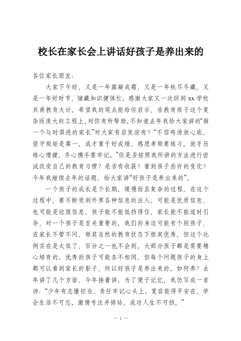 校长在家长会上讲话好孩子是养出来的各位家长朋友:大家下午好,又是一年露凝成霜,又是一年秋尽冬藏,又是一年好时节,储藏知识健体忙。感谢大家又一次回到Xx学校共商教育大计。希望我的观点能给你启示,在教育孩子这个复杂而庞大的工程上,对你有所帮助。不知道去年我给大家讲的“做一个与时俱进的家长”对大家有启发没有?“不信鸡汤放心底,坚守规矩是第一。成才重于好成绩,感恩孝顺要练习。放手历练心理健,齐心携手要牢记。”你是否按照我所讲的方法进行尝试改变自己的教育习惯?是否有收获?看到孩子些许的变化?今年我继续去年的话题,给大家讲“好孩子是养出来的”。一个孩子的成长是个长期、缓慢而且复杂的过程,在这个过程中,要不断受到外界各种信息的注入,可能是优质信息,也可能是垃圾信息,孩子能不能抵挡得住,家长能不能适时引导,对一个孩子是至关重要的。我们的身边可能有个别孩子,在家长不管不问、顺其自然的教育状态下极其优秀,但这个比例实在是太低了,百分之一也不会到。大部分孩子都是需要精心培育的。优秀的孩子可能各不相同,但每个问题孩子的身上都可以看到家长的影子,所以好孩子是养出来的。如何养?去年讲了几个方面,今年接着讲。为了便于记忆,我仍写成一首诗:“少年有志懂担当,责任牢记心头上。宽容能得平安在,学会生活不可忘。激情专注并排站,成功人生不可挡。”