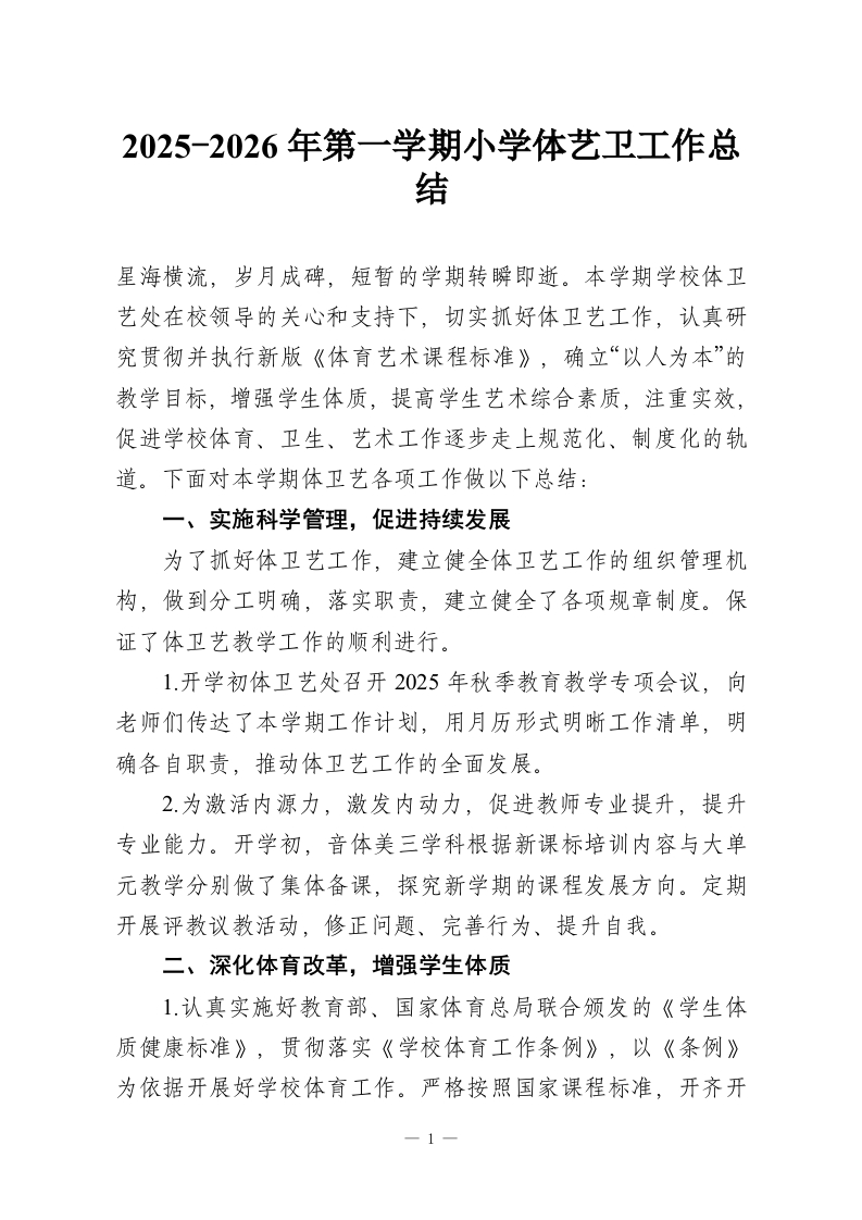 2025-2026年第一学期小学体艺卫工作总结星海横流,岁月成碑,短暂的学期转瞬即逝。本学期学校体卫艺处在校领导的关心和支持下,切实抓好体卫艺工作,认真研究贯彻并执行新版《体育艺术课程标准》,确立“以人为本”的教学目标,增强学生体质,提高学生艺术综合素质,注重实效,促进学校体育、卫生、艺术工作逐步走上规范化、制度化的轨道。下面对本学期体卫艺各项工作做以下总结:一、实施科学管理,促进持续发展为了抓好体卫艺工作,建立健全体卫艺工作的组织管理机构,做到分工明确,落实职责,建立健全了各项规章制度。保证了体卫艺教学工作的顺利进行。1.开学初体卫艺处召开2025年秋季教育教学专项会议,向老师们传达了本学期工作计划,用月历形式明晰工作清单,明确各自职责,推动体卫艺工作的全面发展。2.为激活内源力,激发内动力,促进教师专业提升,提升专业能力。开学初,音体美三学科根据新课标培训内容与大单元教学分别做了集体备课,探究新学期的课程发展方向。定期开展评教议教活动,修正问题、完善行为、提升自我。二、深化体育改革,增强学生体质1.认真实施好教育部、国家体育总局联合颁发的《学生体质健康标准》,贯彻落实《学校体育工作条例》,以《条例》为依据开展好学校体育工作。严格按照国家课程标准,开齐开1