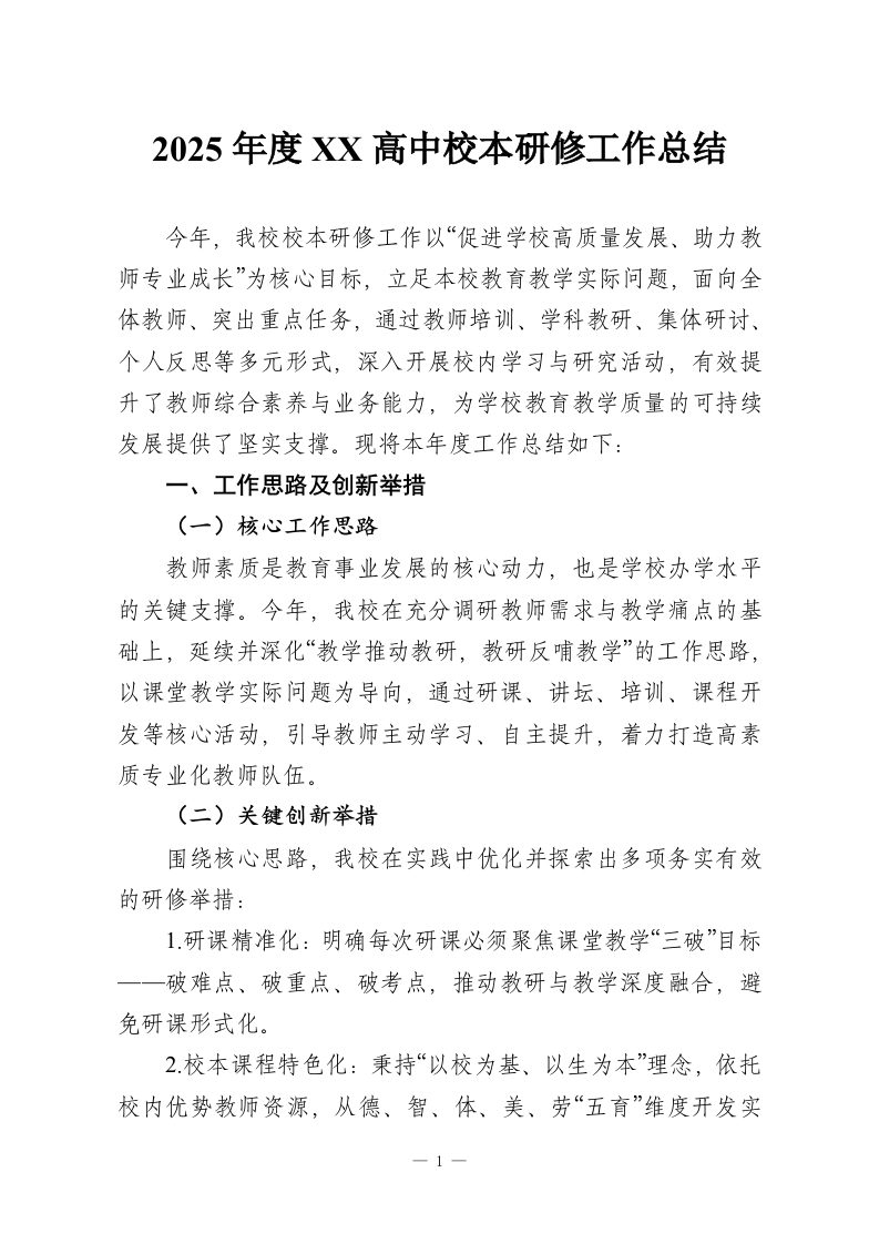 2025年度XX高中校本研修工作总结今年,我校校本研修工作以“促进学校高质量发展、助力教师专业成长”为核心目标,立足本校教育教学实际问题,面向全体教师、突出重点任务,通过教师培训、学科教研、集体研讨、个人反思等多元形式,深入开展校内学习与研究活动,有效提升了教师综合素养与业务能力,为学校教育教学质量的可持续发展提供了坚实支撑。现将本年度工作总结如下:一、工作思路及创新举措(一)核心工作思路教师素质是教育事业发展的核心动力,也是学校办学水平的关键支撑。今年,我校在充分调研教师需求与教学痛点的基础上,延续并深化“教学推动教研,教研反哺教学”的工作思路,以课堂教学实际问题为导向,通过研课、讲坛、培训、课程开发等核心活动,引导教师主动学习、自主提升,着力打造高素质专业化教师队伍。(二)关键创新举措围绕核心思路,我校在实践中优化并探索出多项务实有效的研修举措:1.研课精准化:明确每次研课必须聚焦课堂教学“三破”目标一一破难点、破重点、破考点,推动教研与教学深度融合,避免研课形式化。2.校本课程特色化:秉持“以校为基、以生为本”理念,依托校内优势教师资源,从德、智、体、美、劳“五育”维度开发实1