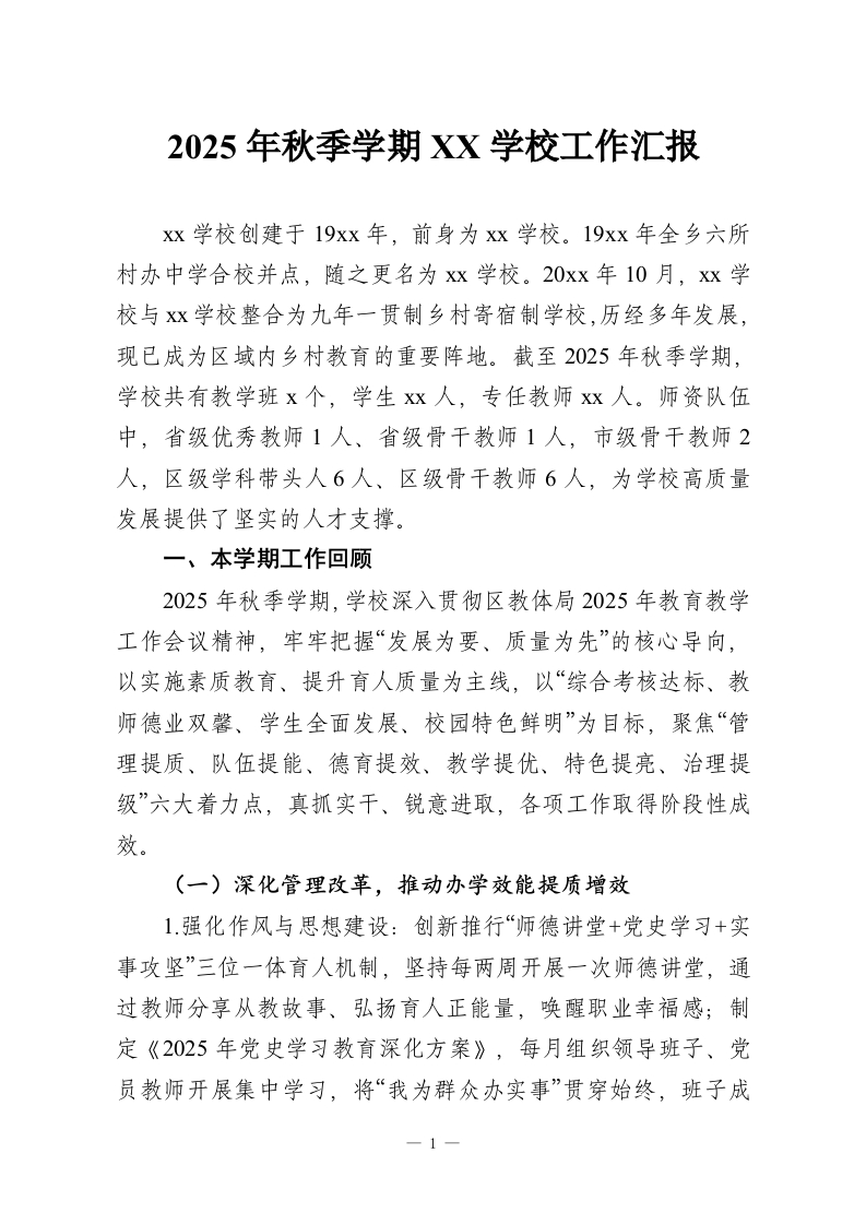 2025年秋季学期XX学校工作汇报xx学校创建于19xx年,前身为Xx学校。19xx年全乡六所村办中学合校并点,随之更名为xx学校。20xx年10月,Xx学校与Xx学校整合为九年一贯制乡村寄宿制学校,历经多年发展,现已成为区域内乡村教育的重要阵地。截至2025年秋季学期,学校共有教学班x个,学生Xx人,专任教师Xx人。师资队伍中,省级优秀教师1人、省级骨干教师1人,市级骨千教师2人,区级学科带头人6人、区级骨干教师6人,为学校高质量发展提供了坚实的人才支撑。一、本学期工作回顾2025年秋季学期,学校深入贯彻区教体局2025年教育教学工作会议精神,牢牢把握“发展为要、质量为先”的核心导向,以实施素质教育、提升育人质量为主线,以“综合考核达标、教师德业双馨、学生全面发展、校园特色鲜明”为目标,聚焦“管理提质、队伍提能、德育提效、教学提优、特色提亮、治理提级”六大着力点,真抓实干、锐意进取,各项工作取得阶段性成效。(一)深化管理改革,推动办学效能提质增效1.强化作风与思想建设:创新推行“师德讲堂+党史学习+实事攻坚”三位一体育人机制,坚持每两周开展一次师德讲堂,通过教师分享从教故事、弘扬育人正能量,唤醒职业幸福感;制定《2025年党史学习教育深化方案》,每月组织领导班子、党员教师开展集中学习,将“我为群众办实事”贯穿始终,班子成