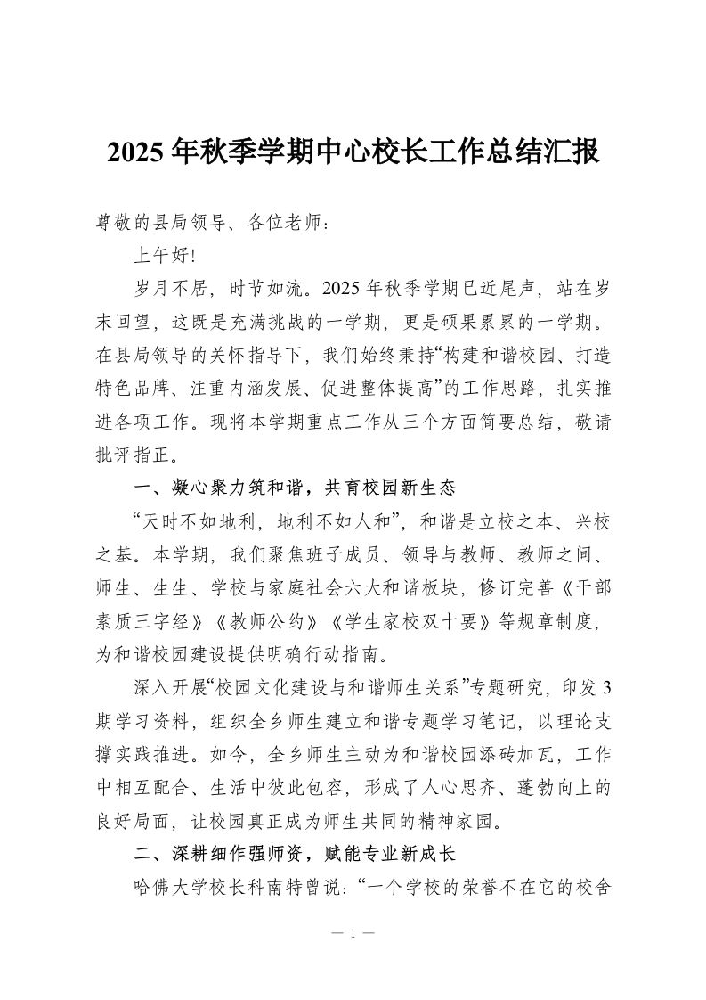 2025年秋季学期中心校长工作总结汇报尊敬的县局领导、各位老师:上午好!岁月不居,时节如流。2025年秋季学期已近尾声,站在岁末回望,这既是充满挑战的一学期,更是硕果累累的一学期。在县局领导的关怀指导下,我们始终秉持“构建和谐校园、打造特色品牌、注重内涵发展、促进整体提高”的工作思路,扎实推进各项工作。现将本学期重点工作从三个方面简要总结,敬请批评指正。一、凝心聚力筑和谐,共育校园新生态“天时不如地利,地利不如人和”,和谐是立校之本、兴校之基。本学期,我们聚焦班子成员、领导与教师、教师之间、师生、生生、学校与家庭社会六大和谐板块,修订完善《干部素质三字经》《教师公约》《学生家校双十要》等规章制度,为和谐校园建设提供明确行动指南。深入开展“校园文化建设与和谐师生关系”专题研究,印发3期学习资料,组织全乡师生建立和谐专题学习笔记,以理论支撑实践推进。如今,全乡师生主动为和谐校园添砖加瓦,工作中相互配合、生活中彼此包容,形成了人心思齐、蓬勃向上的良好局面,让校园真正成为师生共同的精神家园。二、深耕细作强师资,赋能专业新成长哈佛大学校长科南特曾说:“一个学校的荣誉不在它的校舍