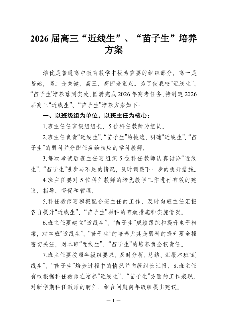 2026届高三“近线生”、“苗子生”培养方案培优是普通高中教育教学中极为重要的组织部分。高一是基础,高二是关键,高三、高四是重点。为了使我校“近线生”、“苗子生培养落到实处,圆满完成2026年高考任务,特制定2026届高三“近线生”、“苗子生”培养方案如下:一、以班级组为单位,以班主任为核心:1.班主任任班级组组长,5位科任教师为组员。2.班主任负责“近线生”、“苗子生”的挑选,明确“近线生”“苗子生”的弱科并分配任务给相应的学科教师。3.每次考试后班主任要组织5位科任教师认真讨论“近线生”、“苗子生”进步与不足的情况,及时调整下一步的提升措施。4.班主任要对5位科任教师的培优教学工作进行有效的建议、指导、督促和管理。5.科任教师要积极配合班主任的工作,及时向班主任汇报各自提升“近线生”、“苗子生”弱科的有效措施和实施情况。班主任要建立“近线生”、“苗子生”成绩跟踪和提升电子档案,对本班“近线生”、“苗子生”的培养尤其是弱科的提升要全程密切关注,对本班“近线生”、“苗子生”的培养负全权责任。7班主任要按照年级组要求,及时分析、总结、汇报本班“近线生”、“苗子生”培养过程中的情况并向级组长汇报。8班主任有权根据科任教师在培养“近线生”、“苗子生”方面的工作表现,对新学期科任教师的聘任、组合问题向年级组提出建议。