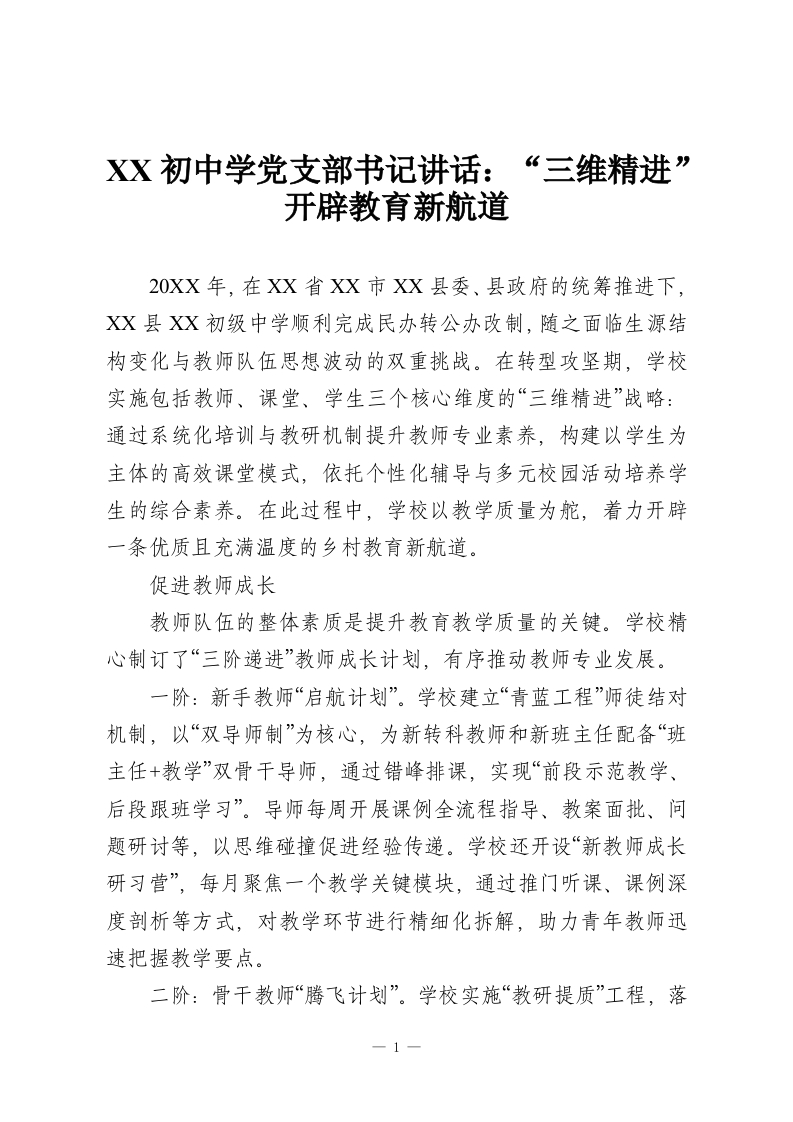 XX初中学党支部书记讲话:“三维精进”开辟教育新航道20XX年,在XX省XX市XX县委、县政府的统筹推进下,XX县XX初级中学顺利完成民办转公办改制,随之面临生源结构变化与教师队伍思想波动的双重挑战。在转型攻坚期,学校实施包括教师、课堂、学生三个核心维度的“三维精进”战略:通过系统化培训与教研机制提升教师专业素养,构建以学生为主体的高效课堂模式,依托个性化辅导与多元校园活动培养学生的综合素养。在此过程中,学校以教学质量为舵,着力开辟一条优质且充满温度的乡村教育新航道。促进教师成长教师队伍的整体素质是提升教育教学质量的关键。学校精心制订了“三阶递进”教师成长计划,有序推动教师专业发展。一阶:新手教师“启航计划”。学校建立“青蓝工程”师徒结对机制,以“双导师制”为核心,为新转科教师和新班主任配备“班主任+教学”双骨干导师,通过错峰排课,实现“前段示范教学、后段跟班学习”。导师每周开展课例全流程指导、教案面批、问题研讨等,以思维碰撞促进经验传递。学校还开设“新教师成长研习营”,每月聚焦一个教学关键模块,通过推门听课、课例深度剖析等方式,对教学环节进行精细化拆解,助力青年教师迅速把握教学要点。二阶:骨干教师“腾飞计划”。学校实施“教研提质”工程,落1