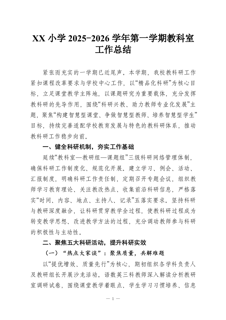 XX小学2025-2026学年第一学期教科室工作总结紧张而充实的一学期已近尾声。本学期,我校教科研工作紧扣课程改革要求与学校中心工作,以“精品化科研”为核心目标,立足课堂教学主阵地,以课题研究为重要载体,充分发挥教科研的先导作用,围绕“科研兴教、助力教师专业化发展”主题,聚焦“构建智慧型课堂、争做智慧型教师、培养智慧型学生”目标,持续完善适配学校教育发展与特色的教科研体系,推动教科研工作稳步向前。一、健全科研机制,夯实工作基础延续“教科室一教研组一课题组”三级科研网络管理体制,确保科研工作制度化、规范化开展。建立学习、例会、活动、汇报制度,明确科研工作责任制,定期召开专题会议,组织教师学习教育理论、关注教改热点、收集前沿科研信息,严格落实“时间、内容、地点、主持人、记录”五落实要求。坚持科研与教研深度融合,让科研贯穿教学全过程,使教科研过程成为转变教学思想、改进教学方法的过程,充分调动教师参与科研的积极性与主动性。二、聚焦五大科研活动,提升科研实效(一)“热点大家谈”:聚焦质量,共解难题以“提优增效、质量先行”为核心,期初组织各学科负责人及教研组长开展沙龙活动。语数英三科教师深入解读分析教研室调研试卷,围绕课堂教学着眼点、学生学习习惯培养、信息1