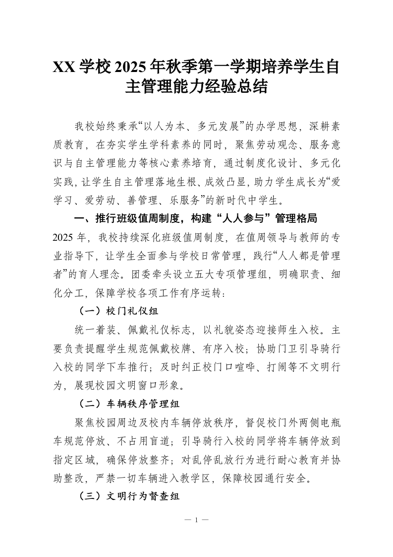 XX学校2025年秋季第一学期培养学生自主管理能力经验总结我校始终秉承“以人为本、多元发展”的办学思想,深耕素质教育,在夯实学生学科素养的同时,聚焦劳动观念、服务意识与自主管理能力等核心素养培育,通过制度化设计、多元化实践,让学生自主管理落地生根、成效凸显,助力学生成长为“爱学习、爱劳动、善管理、乐服务”的新时代中学生。一、推行班级值周制度,构建“人人参与”管理格局2025年,我校持续深化班级值周制度,在值周领导与教师的专业指导下,让学生全面参与学校日常管理,践行“人人都是管理者”的育人理念。团委牵头设立五大专项管理组,明确职责、细化分工,保障学校各项工作有序运转:(一)校门礼仪组统一着装、佩戴礼仪标志,以礼貌姿态迎接师生入校。主要负责提醒学生规范佩戴校牌、有序入校;协助门卫引导骑行入校的同学下车推行;及时纠正校门口喧哗、打闹等不文明行为,展现校园文明窗口形象。(二)车辆秩序管理组聚焦校园周边及校内车辆停放秩序,督促校门外两侧电瓶车规范停放、不占用盲道;引导骑行入校的同学将车辆停放到指定区域,确保停放整齐;对乱停乱放行为进行耐心教育并协助整改,严禁一切车辆进入教学区,保障校园通行安全。(三)文明行为督查组1