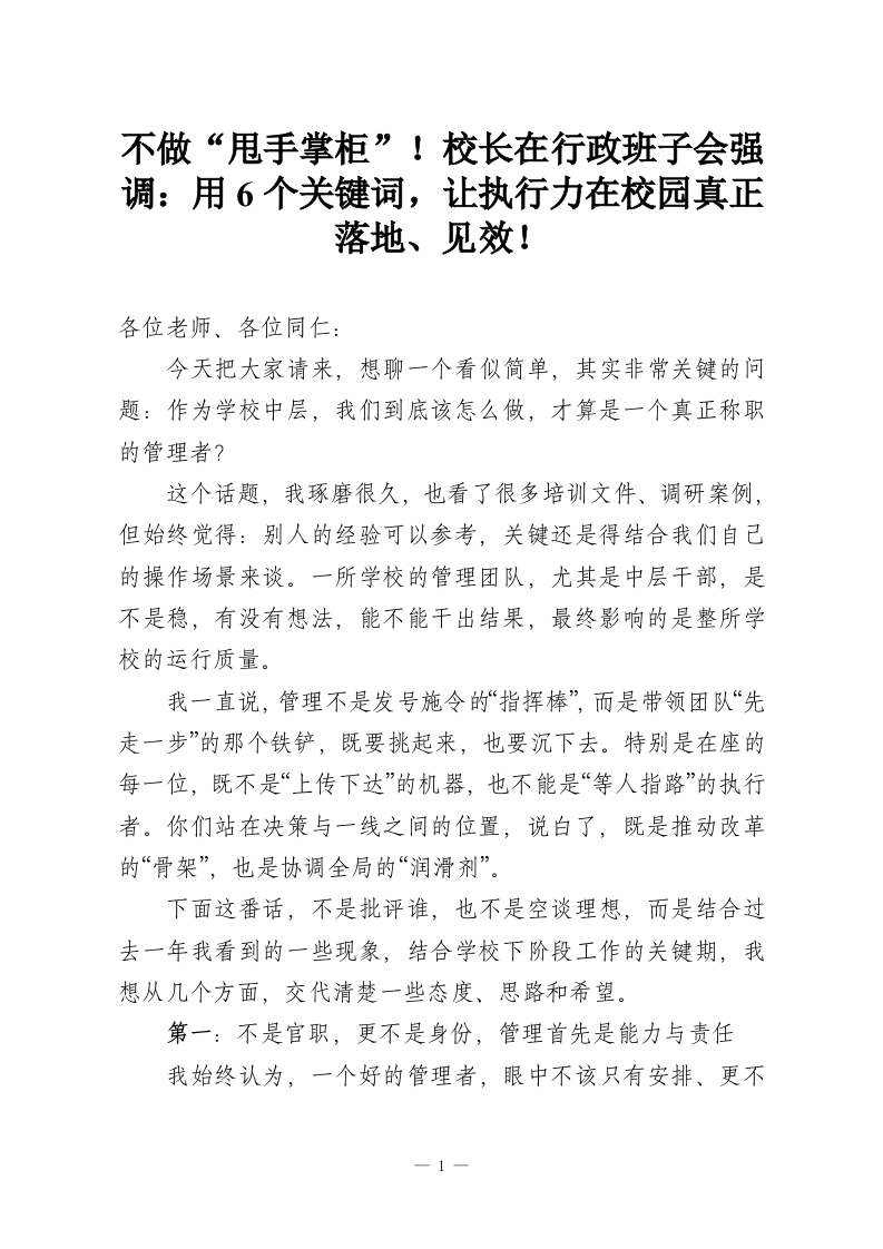 不做“甩手掌柜”!校长在行政班子会强调:用6个关键词,让执行力在校园真正落地、见效!各位老师、各位同仁:今天把大家请来,想聊一个看似简单,其实非常关键的问题:作为学校中层,我们到底该怎么做,才算是一个真正称职的管理者?这个话题,我琢磨很久,也看了很多培训文件、调研案例,但始终觉得:别人的经验可以参考,关键还是得结合我们自已的操作场景来谈。一所学校的管理团队,尤其是中层干部,是不是稳,有没有想法,能不能干出结果,最终影响的是整所学校的运行质量。我一直说,管理不是发号施令的“指挥棒”,而是带领团队“先走一步”的那个铁铲,既要挑起来,也要沉下去。特别是在座的每一位,既不是“上传下达”的机器,也不能是“等人指路”的执行者。你们站在决策与一线之间的位置,说白了,既是推动改革的“骨架”,也是协调全局的“润滑剂”。下面这番话,不是批评谁,也不是空谈理想,而是结合过去一年我看到的一些现象,结合学校下阶段工作的关键期,我想从几个方面,交代清楚一些态度、思路和希望。第一:不是官职,更不是身份,管理首先是能力与责任我始终认为,一个好的管理者,眼中不该只有安排、更不