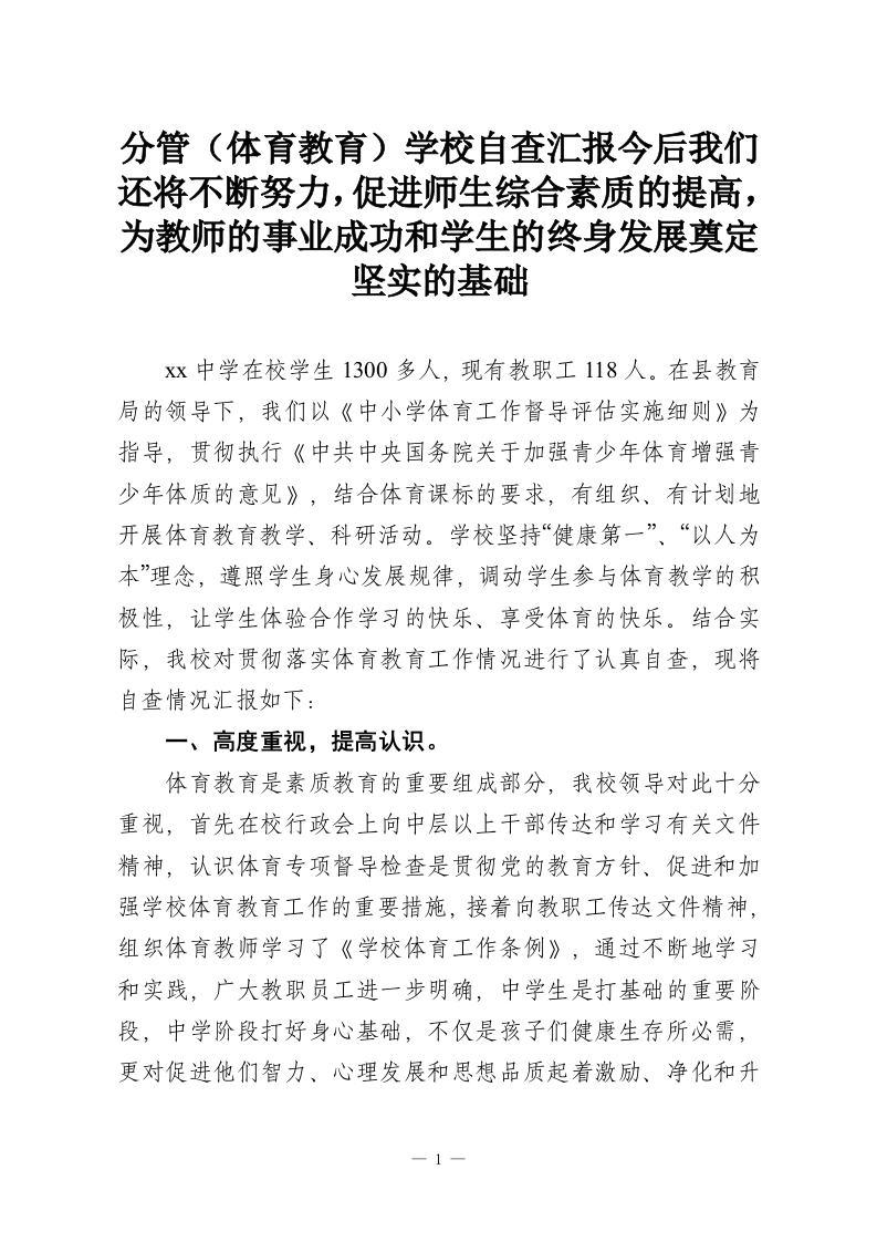 分管(体育教育)学校自查汇报今后我们还将不断努力,促进师生综合素质的提高,为教师的事业成功和学生的终身发展奠定坚实的基础xx中学在校学生1300多人,现有教职工118人。在县教育局的领导下,我们以《中小学体育工作督导评估实施细则》为指导,贯彻执行《中共中央国务院关于加强青少年体育增强青少年体质的意见》,结合体育课标的要求,有组织、有计划地开展体育教育教学、科研活动。学校坚持“健康第一”、“以人为本”理念,遵照学生身心发展规律,调动学生参与体育教学的积极性,让学生体验合作学习的快乐、享受体育的快乐。结合实际,我校对贯彻落实体育教育工作情况进行了认真自查,现将自查情况汇报如下:一、高度重视,提高认识。体育教育是素质教育的重要组成部分,我校领导对此十分重视,首先在校行政会上向中层以上干部传达和学习有关文件精神,认识体育专项督导检查是贯彻党的教育方针、促进和加强学校体育教育工作的重要措施,接着向教职工传达文件精神,组织体育教师学习了《学校体育工作条例》,通过不断地学习和实践,广大教职员工进一步明确,中学生是打基础的重要阶段,中学阶段打好身心基础,不仅是孩子们健康生存所必需,更对促进他们智力、心理发展和思想品质起着激励、净化和升