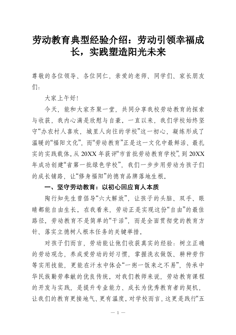 劳动教育典型经验介绍:劳动引领幸福成长,实践塑造阳光未来尊敬的各位领导、各位同仁,亲爱的老师、同学们、家长朋友们:大家上午好!今天,能和大家齐聚一堂,共同分享我校劳动教育的探索与收获,我内心满是欣慰与自豪。一直以来,我们学校始终坚守“办农村人喜欢,城里人向往的学校”这一初心,凝练形成了温暖的“福阳文化”,而“劳动教育”正是这一文化中最鲜活、最扎实的实践载体。从20XX年获评“市首批劳动教育学校”,到20XX年成功创建“省第一批绿色学校”,我们一步步用劳动为孩子们的成长铺路,让“修身福阳”的德育品牌落地生根。一、坚守劳动教育:以初心回应育人本质陶行知先生曾倡导“六大解放”,让孩子的头脑、双手、眼晴都能自由生长。在我看来,劳动正是实现这份“自由”的最佳路径。劳动教育不是简单的“干活”,而是全面贯彻党的教育方针、落实立德树人根本任务的关键举措。对孩子们而言,劳动能让他们收获真实的经验:树立正确的劳动观念,养成爱劳动的好习惯,掌握洗衣做饭、耕种劳作等实用技能,更能在汗水中体会“一粥一饭来之不易”,传承中华民族勤劳奉献的优良传统。对我们教师来说,劳动教育课程的开发与实践,是提升专业能力、成长为优秀教育者的契机,让我们的教育更接地气、更有温度。对学校而言,这更是践行“五1