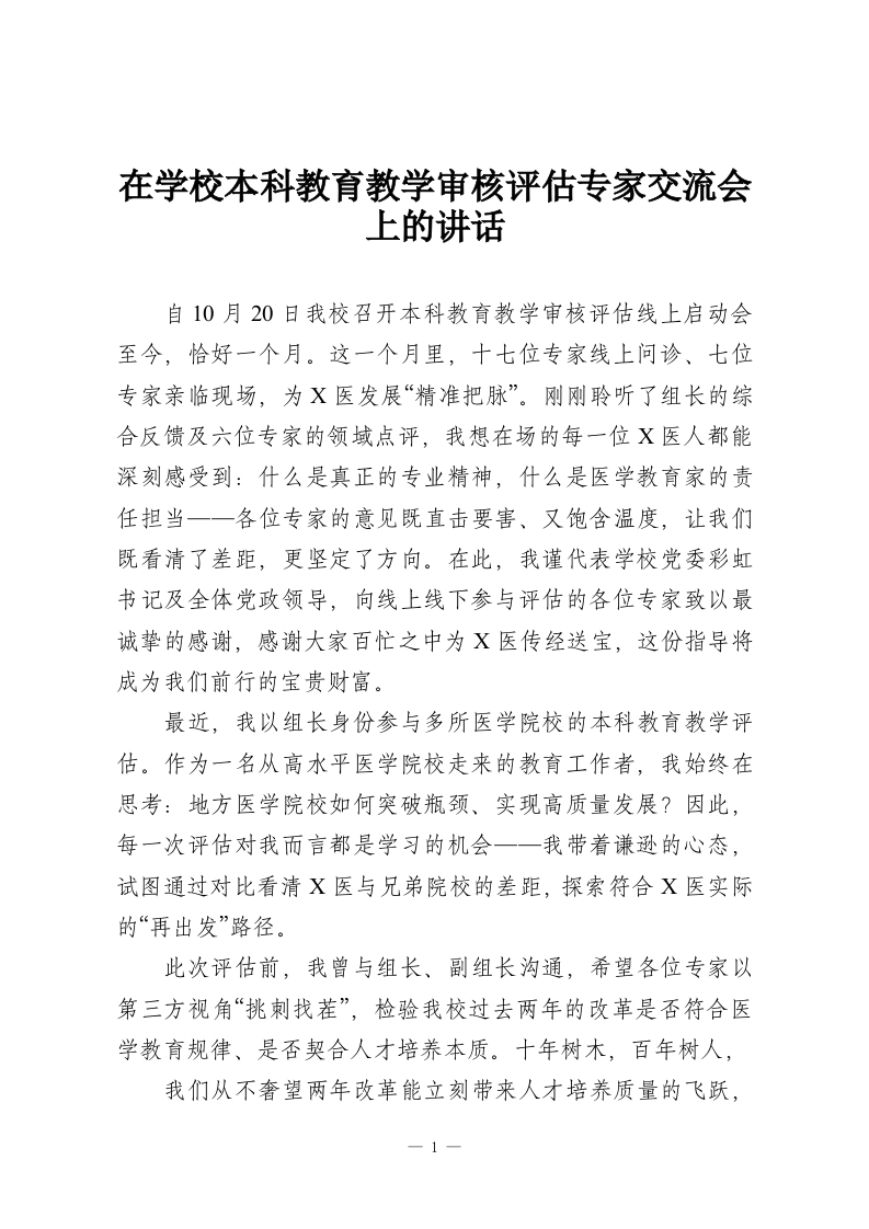 在学校本科教育教学审核评估专家交流会上的讲话自10月20日我校召开本科教育教学审核评估线上启动会至今,恰好一个月。这一个月里,十七位专家线上问诊、七位专家亲临现场,为X医发展“精准把脉”。刚刚聆听了组长的综合反馈及六位专家的领域点评,我想在场的每一位X医人都能深刻感受到:什么是真正的专业精神,什么是医学教育家的责任担当一一各位专家的意见既直击要害、又饱含温度,让我们既看清了差距,更坚定了方向。在此,我谨代表学校党委彩虹书记及全体党政领导,向线上线下参与评估的各位专家致以最诚挚的感谢,感谢大家百忙之中为X医传经送宝,这份指导将成为我们前行的宝贵财富。最近,我以组长身份参与多所医学院校的本科教育教学评估。作为一名从高水平医学院校走来的教育工作者,我始终在思考:地方医学院校如何突破瓶颈、实现高质量发展?因此,每一次评估对我而言都是学习的机会一一我带着谦逊的心态,试图通过对比看清X医与兄弟院校的差距,探索符合X医实际的“再出发”路径。此次评估前,我曾与组长、副组长沟通,希望各位专家以第三方视角“挑刺找茬”,检验我校过去两年的改革是否符合医学教育规律、是否契合人才培养本质。十年树木,百年树人,我们从不奢望两年改革能立刻带来人才培养质量的飞跃,1