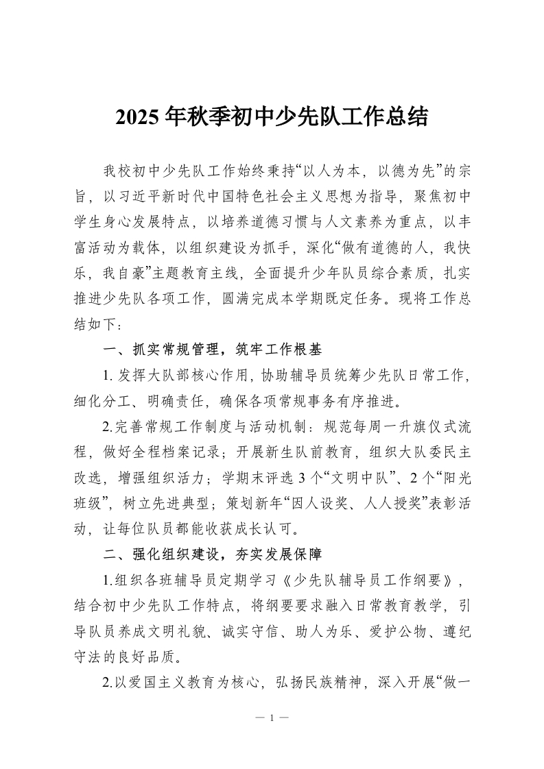 2025年秋季初中少先队工作总结我校初中少先队工作始终秉持“以人为本,以德为先”的宗旨,以习近平新时代中国特色社会主义思想为指导,聚焦初中学生身心发展特点,以培养道德习惯与人文素养为重点,以丰富活动为载体,以组织建设为抓手,深化“做有道德的人,我快乐,我自豪”主题教育主线,全面提升少年队员综合素质,扎实推进少先队各项工作,圆满完成本学期既定任务。现将工作总结如下:一、抓实常规管理,筑牢工作根基1.发挥大队部核心作用,协助辅导员统筹少先队日常工作,细化分工、明确责任,确保各项常规事务有序推进。2.完善常规工作制度与活动机制:规范每周一升旗仪式流程,做好全程档案记录;开展新生队前教育,组织大队委民主改选,增强组织活力;学期未评选3个“文明中队”、2个“阳光班级”,树立先进典型;策划新年“因人设奖、人人授奖”表彰活动,让每位队员都能收获成长认可。二、强化组织建设,夯实发展保障1.组织各班辅导员定期学习《少先队辅导员工作纲要》,结合初中少先队工作特点,将纲要要求融入日常教育教学,引导队员养成文明礼貌、诚实守信、助人为乐、爱护公物、遵纪守法的良好品质。2.以爱国主义教育为核心,弘扬民族精神,深入开展“做一1