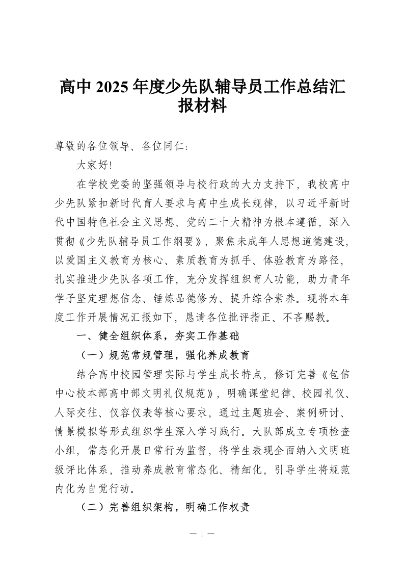 高中2025年度少先队辅导员工作总结汇报材料尊敬的各位领导、各位同仁:大家好!在学校党委的坚强领导与校行政的大力支持下,我校高中少先队紧扣新时代育人要求与高中生成长规律,以习近平新时代中国特色社会主义思想、党的二十大精神为根本遵循,深入贯彻《少先队辅导员工作纲要》,聚焦未成年人思想道德建设,以爱国主义教育为核心、素质教育为抓手、体验教育为路径,扎实推进少先队各项工作,充分发挥组织育人功能,助力青年学子坚定理想信念、锤炼品德修为、提升综合素养。现将本年度工作开展情况汇报如下,恳请各位批评指正、不吝赐教。一、健全组织体系,夯实工作基础(一)规范常规管理,强化养成教育结合高中校园管理实际与学生成长特点,修订完善《包信中心校本部高中部文明礼仪规范》,明确课堂纪律、校园礼仪、人际交往、仪容仪表等核心要求,通过主题班会、案例研讨、情景模拟等形式组织学生深入学习践行。大队部成立专项检查小组,常态化开展日常行为监督,将学生表现全面纳入文明班级评比体系,推动养成教育常态化、精细化,引导学生将规范内化为自觉行动。(二)完善组织架构,明确工作权责1
