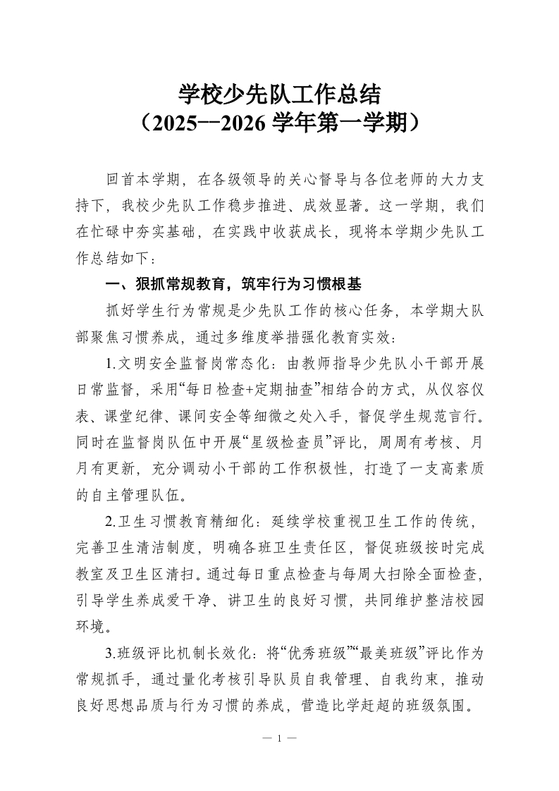 学校少先队工作总结(2025--2026学年第一学期)回首本学期,在各级领导的关心督导与各位老师的大力支持下,我校少先队工作稳步推进、成效显著。这一学期,我们在忙碌中夯实基础,在实践中收获成长,现将本学期少先队工作总结如下:一、狠抓常规教育,筑牢行为习惯根基抓好学生行为常规是少先队工作的核心任务,本学期大队部聚焦习惯养成,通过多维度举措强化教育实效:1.文明安全监督岗常态化:由教师指导少先队小干部开展日常监督,采用“每日检查+定期抽查”相结合的方式,从仪容仪表、课堂纪律、课间安全等细微之处入手,督促学生规范言行。同时在监督岗队伍中开展“星级检查员”评比,周周有考核、月月有更新,充分调动小干部的工作积极性,打造了一支高素质的自主管理队伍。2卫生习惯教育精细化:延续学校重视卫生工作的传统,完善卫生清洁制度,明确各班卫生责任区,督促班级按时完成教室及卫生区清扫。通过每日重点检查与每周大扫除全面检查,引导学生养成爱干净、讲卫生的良好习惯,共同维护整洁校园环境。3.班级评比机制长效化:将“优秀班级“最美班级”评比作为常规抓手,通过量化考核引导队员自我管理、自我约束,推动良好思想品质与行为习惯的养成,营造比学赶超的班级氛围。1
