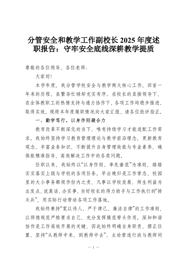 分管安全和教学工作副校长2025年度述职报告:守牢安全底线深耕教学提质尊敬的各位领导、各位老师:大家好!本学年度,我分管学校安全与教学两大核心工作。回首一年来的历程,虽繁杂忙碌却充实有序。在校长的直接领导下,在全体教职工的热情支持与通力协作下,各项工作均稳步推进、取得实效。现将本年度履职情况向大家汇报,请各位批评指正。一、勤学笃行,以身作则凝合力教育改革不断深化的当下,唯有持续学习才能适配工作需求。我始终坚持学习教育管理理论与教学前沿理念,更新教育观念、丰富业务知识,不断提升自身管理效能与专业素养,确保能精准指导、高效解决工作中的各类问题。任职以来,我始终以“以身作则、率先垂范”为准则,踏踏实实落实上级与学校的各项任务。早出晚归是工作常态,校园里的大小事务都视作份内之责,凡事以学校发展、师生利益为出发点,说真话、办实事,当好校长的得力助手与工作执行的“排头兵”,用实际行动带动各项工作落地。我始终秉持“宽以待人、严于律己、廉洁自律”的工作准则,以师德规范严格要求自己,充分发挥模范带头作用。深知和谐协作是工作高效开展的关键,因此始终明确自身职责、摆正位置,坚持“从教师中来,到教师中去”,主动营造行政与教师间1