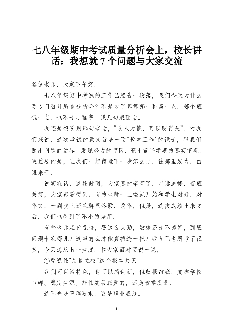 七八年级期中考试质量分析会上,校长讲话:我想就7个问题与大家交流各位老师,大家下午好:七八年级期中考试的工作已经告一段落,我们今天为什么要专门召开质量分析会?不是为了算算哪一科高一点、哪个班低一点,也不是走程序、说几句表面话。我还是想引用那句老话,“以人为镜,可以明得失”。对我们来说,这次考试的意义就是一面“教学工作”的镜子,帮我们照出问题的边界、发现努力的盲区、亮出前半学期的真实情况,更重要的是,让我们一起商量下一步怎么走、往哪里发力、由说实在话,这段时间,大家真的辛苦了。早读进楼、夜班关灯,大家都看得到:有的老师一上楼就开始和学生对题、对作文,一到晚上还在群里答疑、改作。但是,这次成绩出来之后,我们也看到了不小的差距。有些老师难免觉得,费这么大劲,数据还是不够好,到底问题卡在哪儿?这事怎么才能真推进一把?我自己也思考了很多,今天想从七个角度,和大家面对面说一说。①要稳住“质量立校”这个根本共识我们可以谈特色,也可以搞创新,但归根结底,支撑学校口碑、稳定生源、托住发展底盘的,还是教学质量。这不光是管理要求,更是职业底线。1