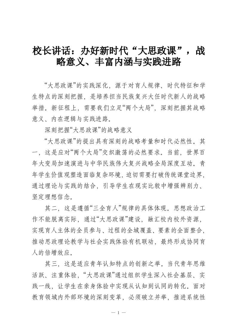 校长讲话:办好新时代“大思政课”,战略意义、丰富内涵与实践进路“大思政课”的实践深化,源于对育人规律、时代特征和学生特点的深刻把握,是培养担当民族复兴大任时代新人的战略举措。新征程上,需要我们立足“两个大局”,深刻把握其战略意义、内在逻辑与实践进路。深刻把握“大思政课”的战略意义“大思政课”的提出具有深刻的战略考量和时代必然性。其一,这是应对“两个大局”交织激荡的必然要求。当前,世界百年大变局加速演进与中华民族伟大复兴战略全局深度互动。青年学生价值观塑造面临复杂环境,迫切需要打破传统课堂边界,通过理论与实践的结合,引导学生在现实比较中增强辨别力、坚定理想信念。其二,这是遵循“三全育人”规律的具体体现。思想政治工作不能脱离实际,通过“大思政课”建设,融汇校内校外资源,实现育人主体的全员参与、过程的全域覆盖、要素的全面整合,推动思政理论教学与社会实践体验有机联动,最终形成协同育人的倍增效应。其三,这是适应青年认知特点的创新之举。当代青年思维活跃、注重体验,“大思政课”通过组织学生深入社会基层、实践一线,让学生在亲身体验中实现从认知到认同的转化。面对教育领域内外部环境的深刻变革,必须破立并举,推进系统性1