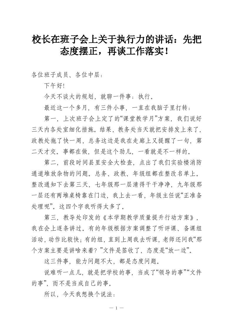 校长在班子会上关于执行力的讲话:先把态度摆正,再谈工作落实!各位班子成员、各位中层:下午好!今天不谈大的规划,就聊一件事:执行。最近这一个多月,有三件小事,一直在我脑子里打转:第一,上次班子会上定了的“课堂教学月”方案,我们说好三天内各处室细化措施。结果,教务处当天就把安排发上来了,政教处拖了快一周,总务这边是我在走廊上又提醒了一句,第二天才交。事都在做,但是这个劲儿,一看就是不一样的。第二,前段时间县里安全大检查,点出了我们实验楼消防通道堆放杂物的问题。总务、政教、年级组都在整改名单上。整改通知下去第三天,七年级那一层清得干干净净,九年级那一层还有两堆桌椅靠在门边,我上去一看,年级主任说“正准备处理呢”。这四个字我听得太多了。第三,教导处印发的《本学期教学质量提升行动方案》,我在会上逐条讲过。有的年级根据方案调整了听评课、备课组活动,动作比较快;有的组,直到上周我去听课,老师还问我“那个方案主要是讲啥来着?”文件是签收了,态度是“放一边”。这三件事,能力问题不大,都是态度问题。说难听一点儿,就是把学校的事,当成了“领导的事”“文件的事”,而不是当成自己的事。所以,今天我想换个说法:1